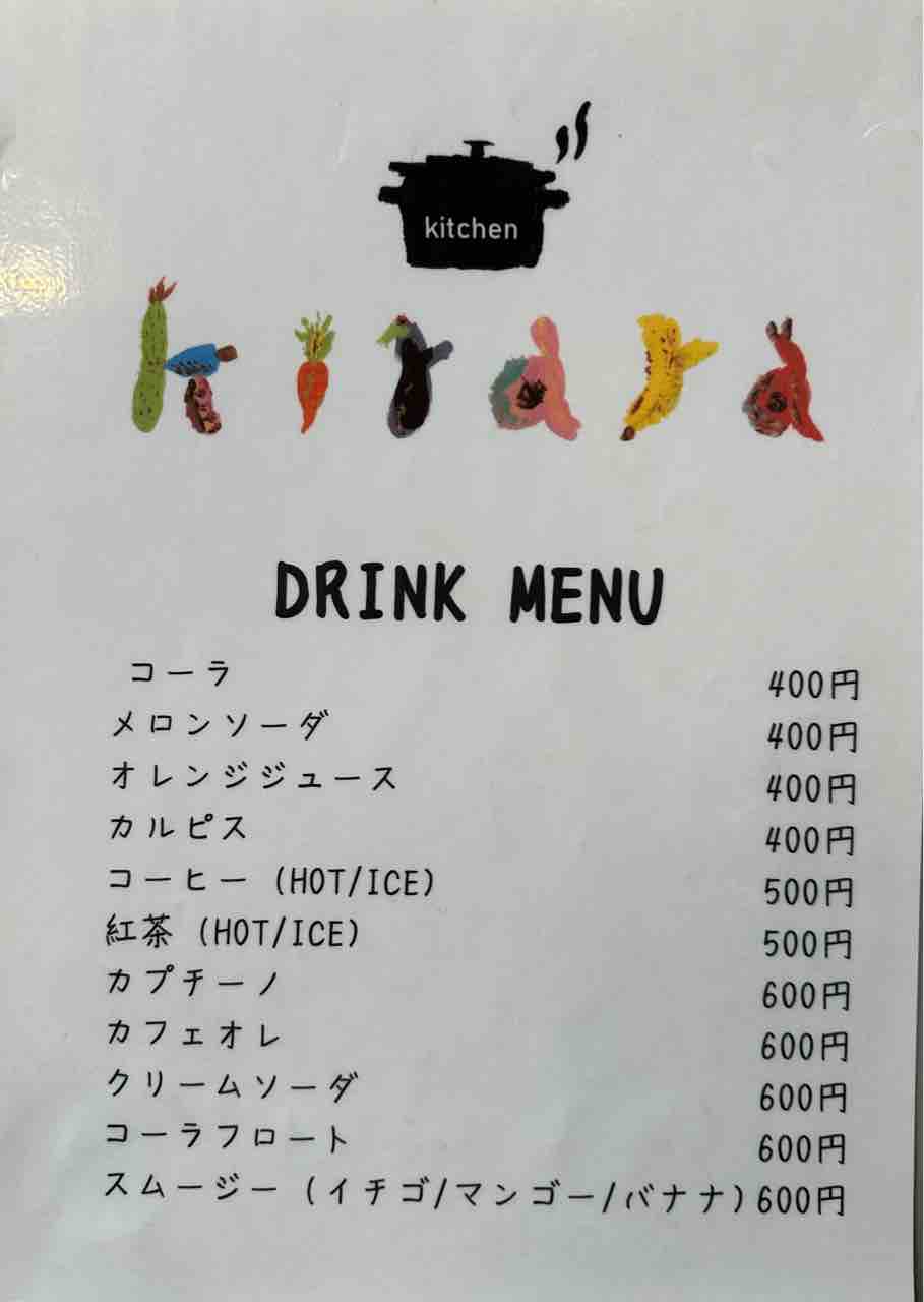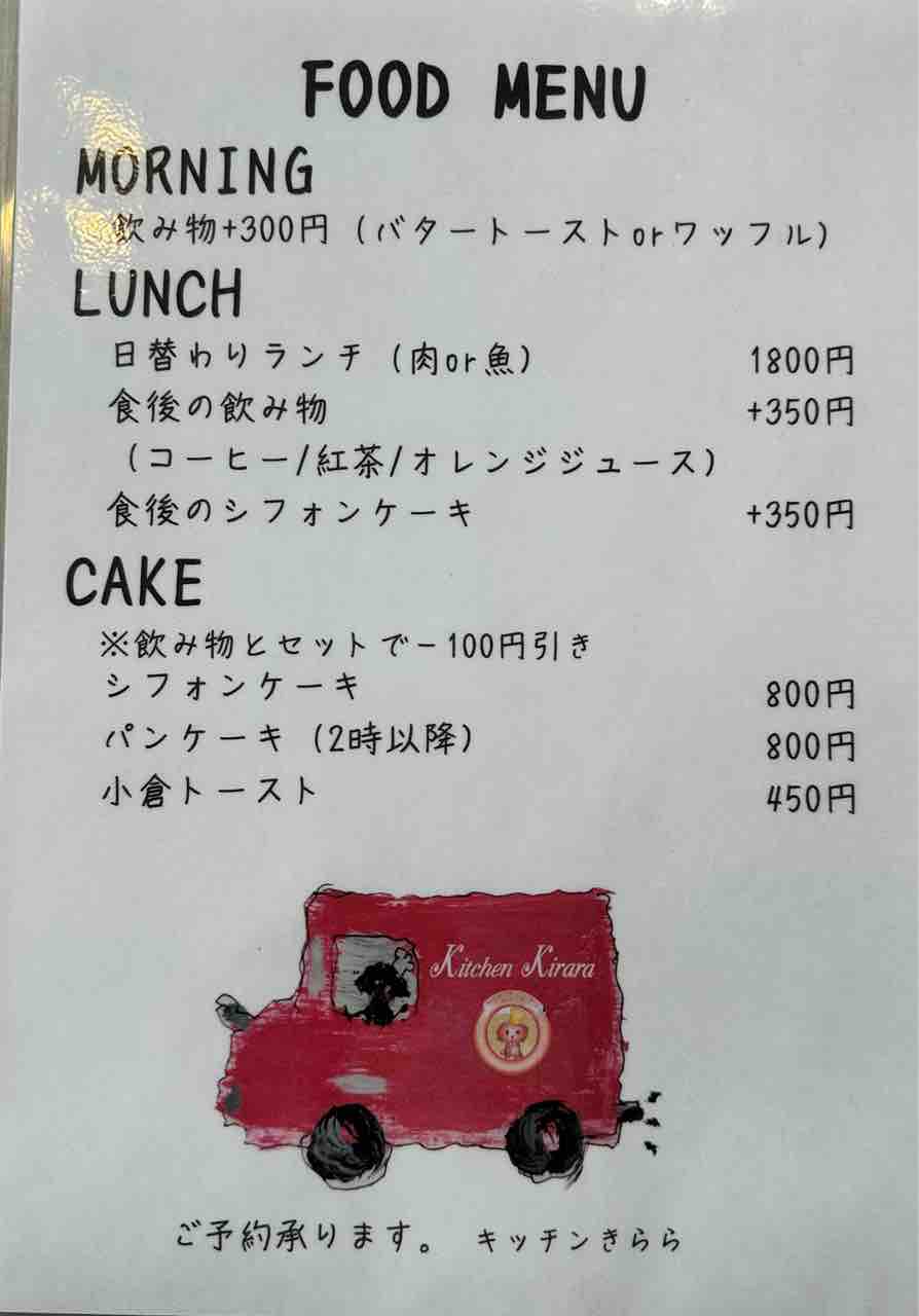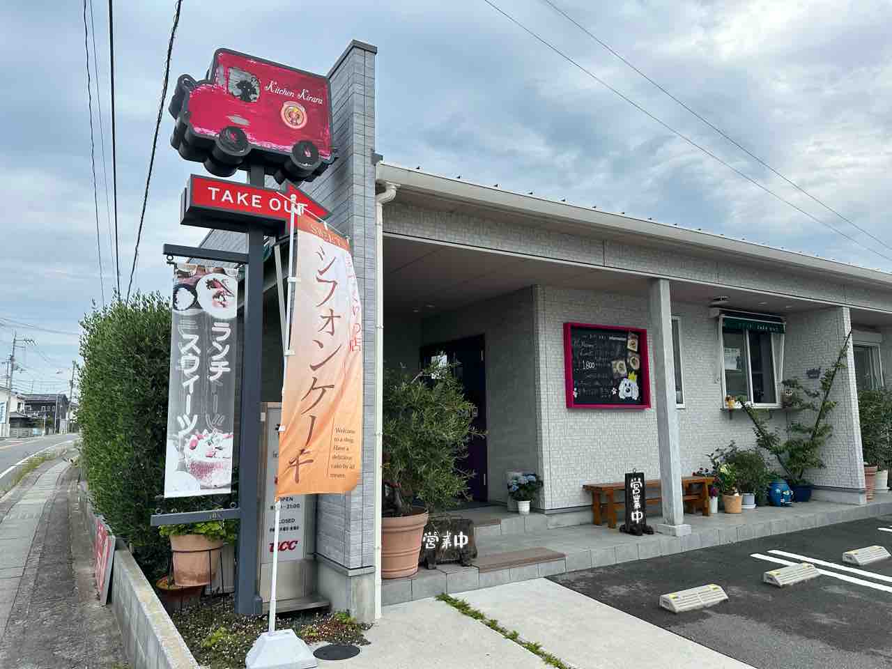 入口横の黒板には手書きのインフォメーションが掲げられ、思わず足を止めたくなるあたたかさがあります。赤いキッチンカーを模した立体的な看板には「Kitchen Kirara」のロゴが描かれ、可愛らしいアクセントに。下には「TAKE OUT」の案内もあり、テイクアウトの利用も歓迎している様子。
