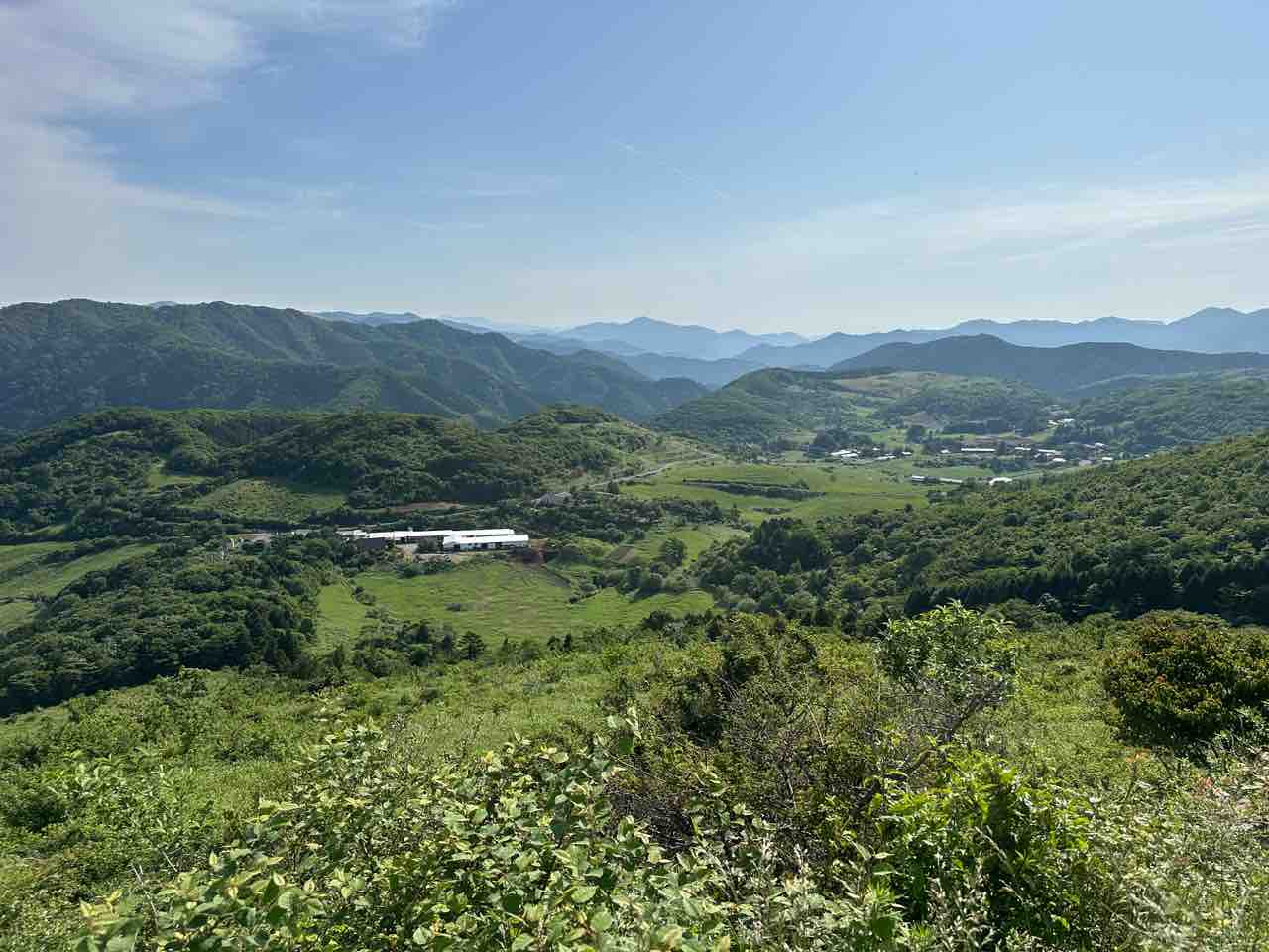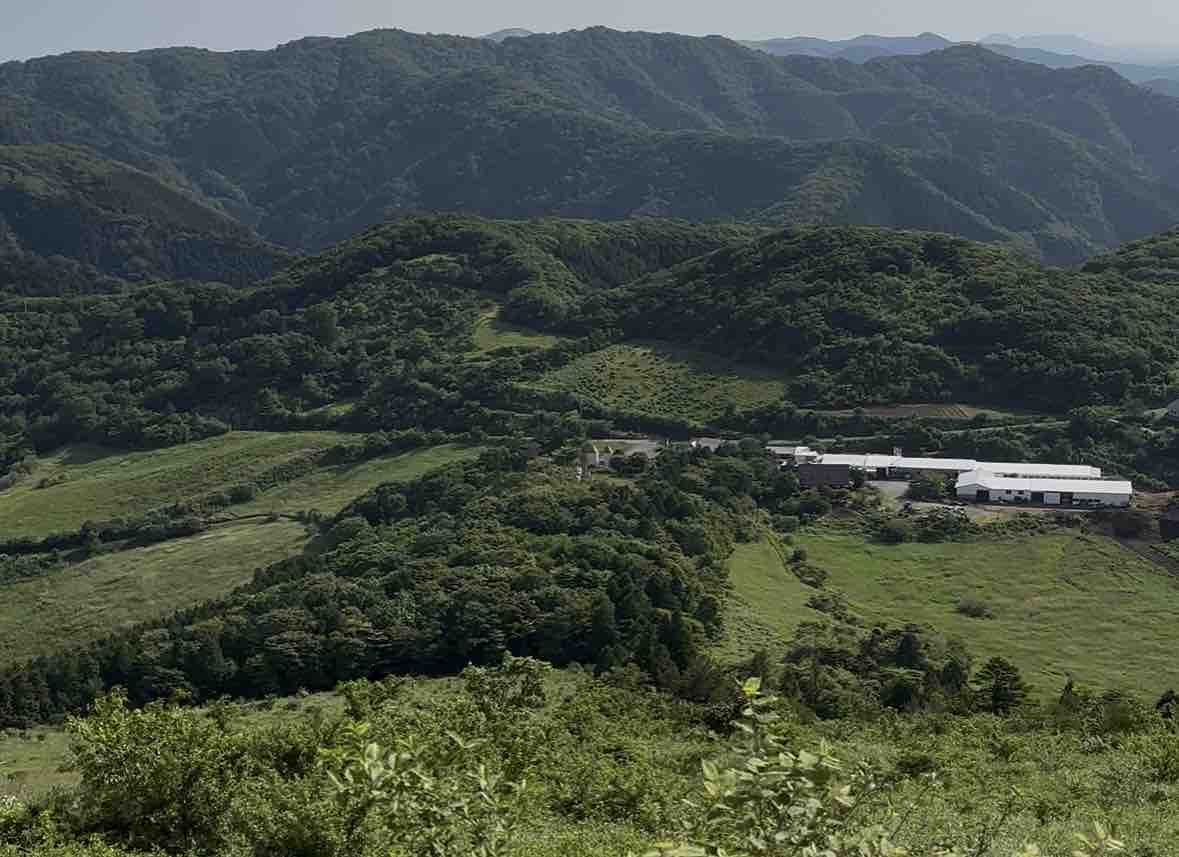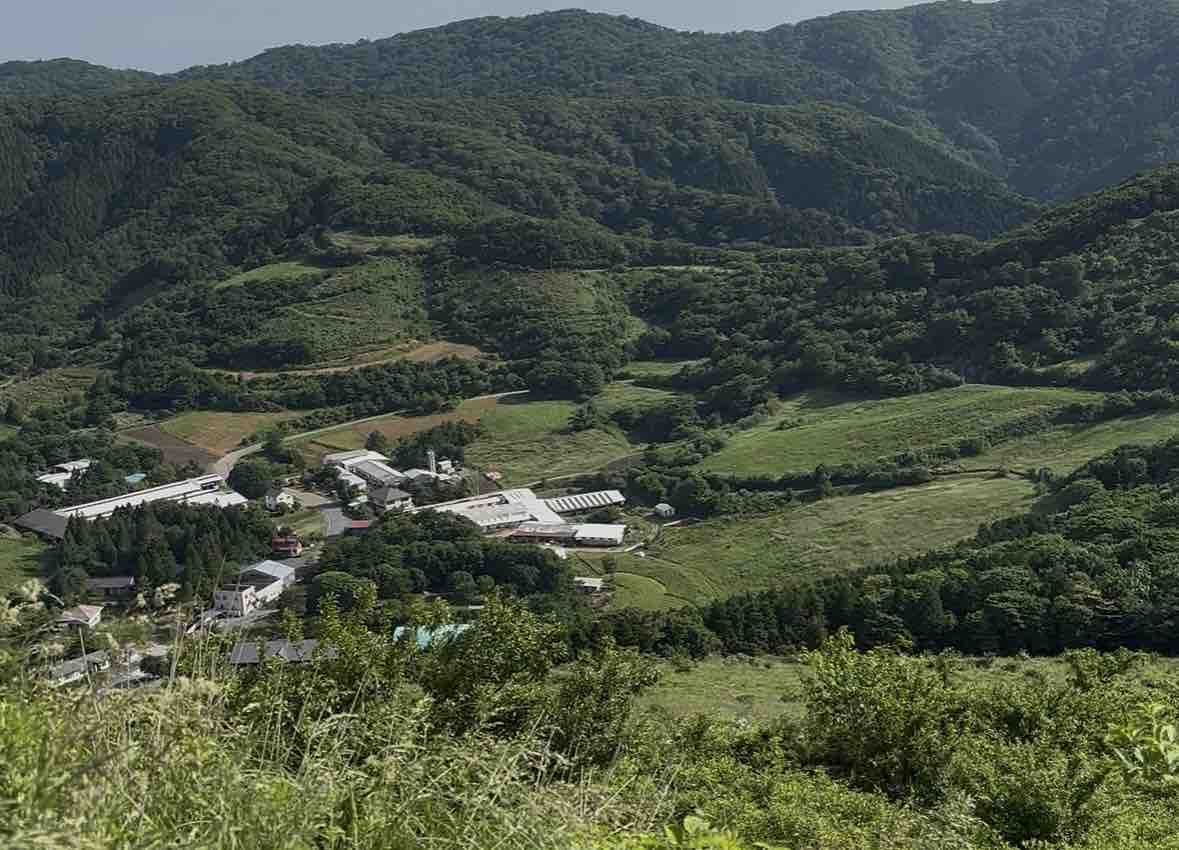 緑のなだらかな丘が続き、点在する白い牧舎や民家がどこかヨーロッパの山村を思わせる、穏やかで牧歌的な風景を生み出しています。この日は梅雨の晴れ間に恵まれ、空の青と新緑のコントラストがひときわ鮮やかに感じられました。