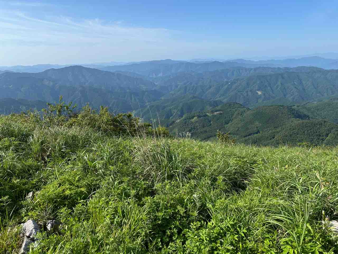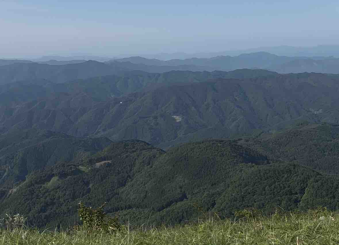 「源氏ヶ駄場」の頂上からは、愛媛県内はもちろん、高知県側の山並みまで一望できます。晴れた日には幾重にも重なる山々が青くかすみ、空と地平の境目が溶け合うような景色が広がります。