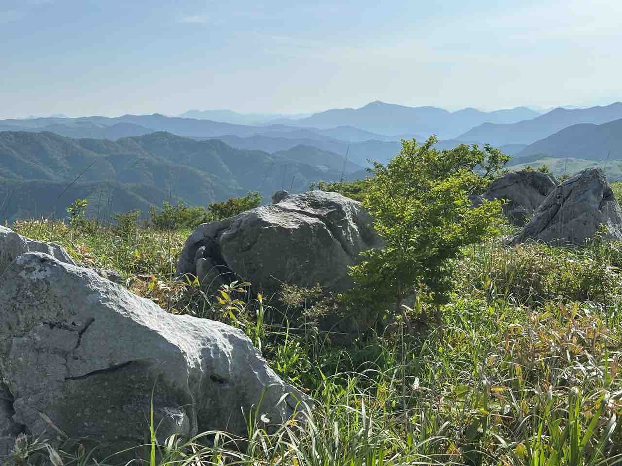 登るにつれて視界は次第に開け、振り返るたびに広がる大野ヶ原の風景に心が躍ります。頂上にはベンチなどの施設はありませんが、白い石灰岩が広がる独特の風景と、爽やかな高原の風が出迎えてくれます。