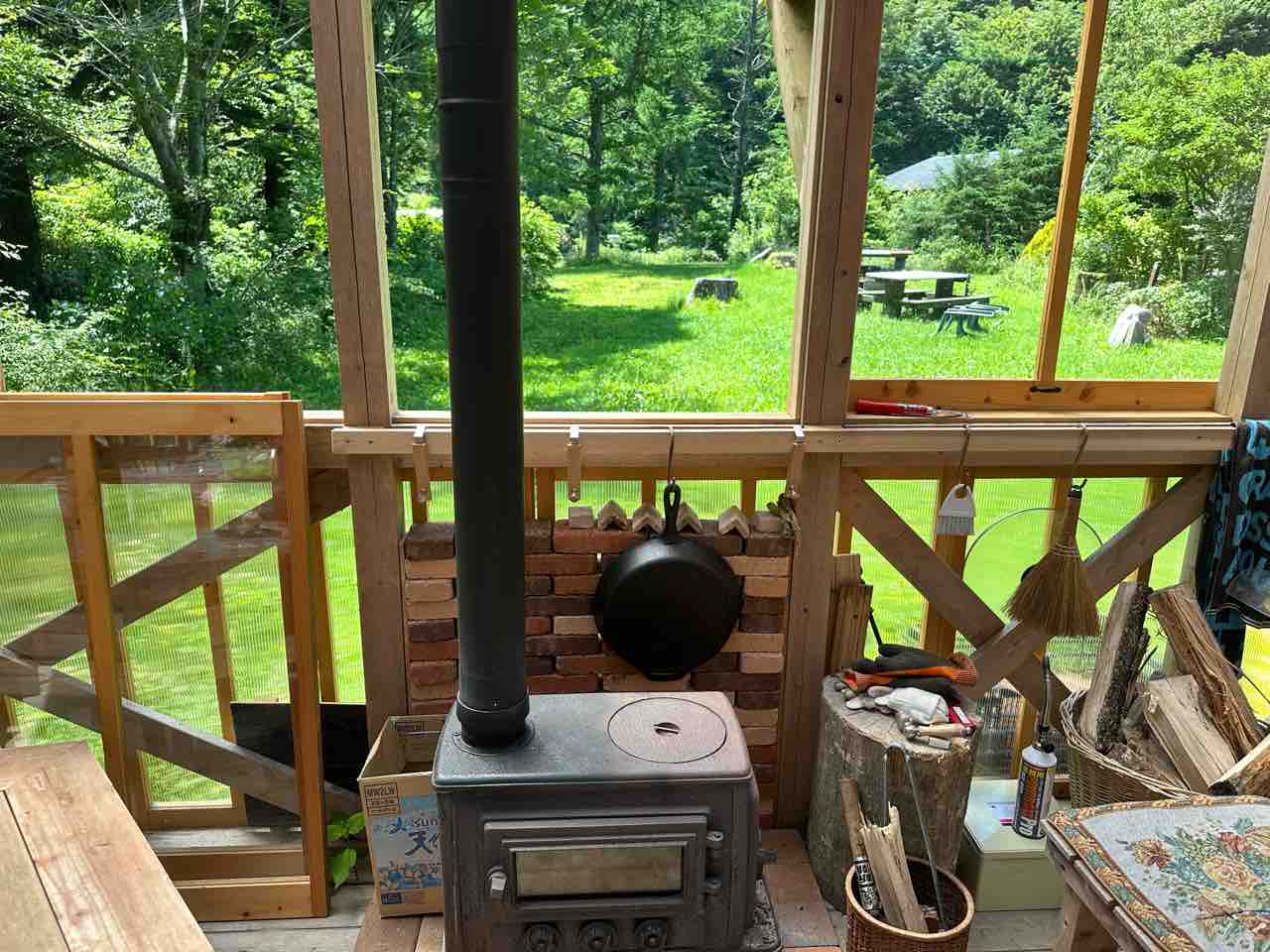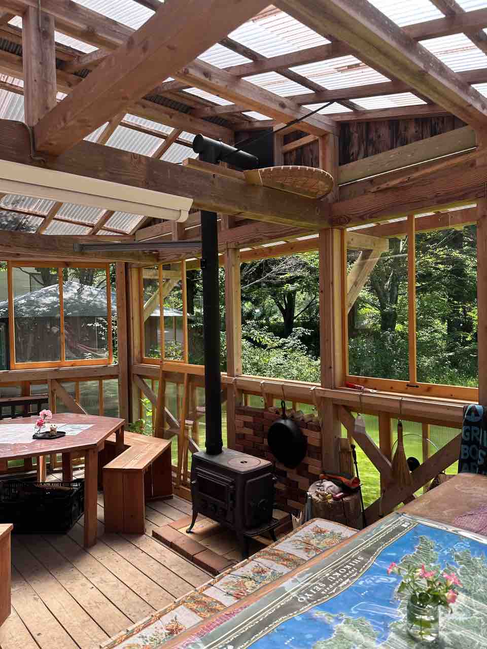 屋根付きテラスには薪ストーブもあり、寒い季節でもゆったりと過ごせます。そして、テラス席から眺める庭の緑はまぶしいほどに輝き、まるで森の中の特等席に座っているかのよう。自然の中で過ごす穏やかな時間がここにはあります。