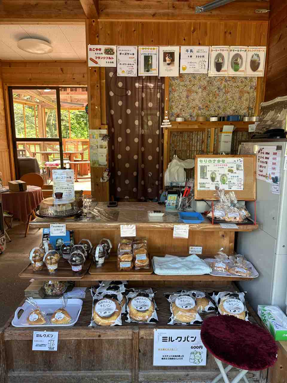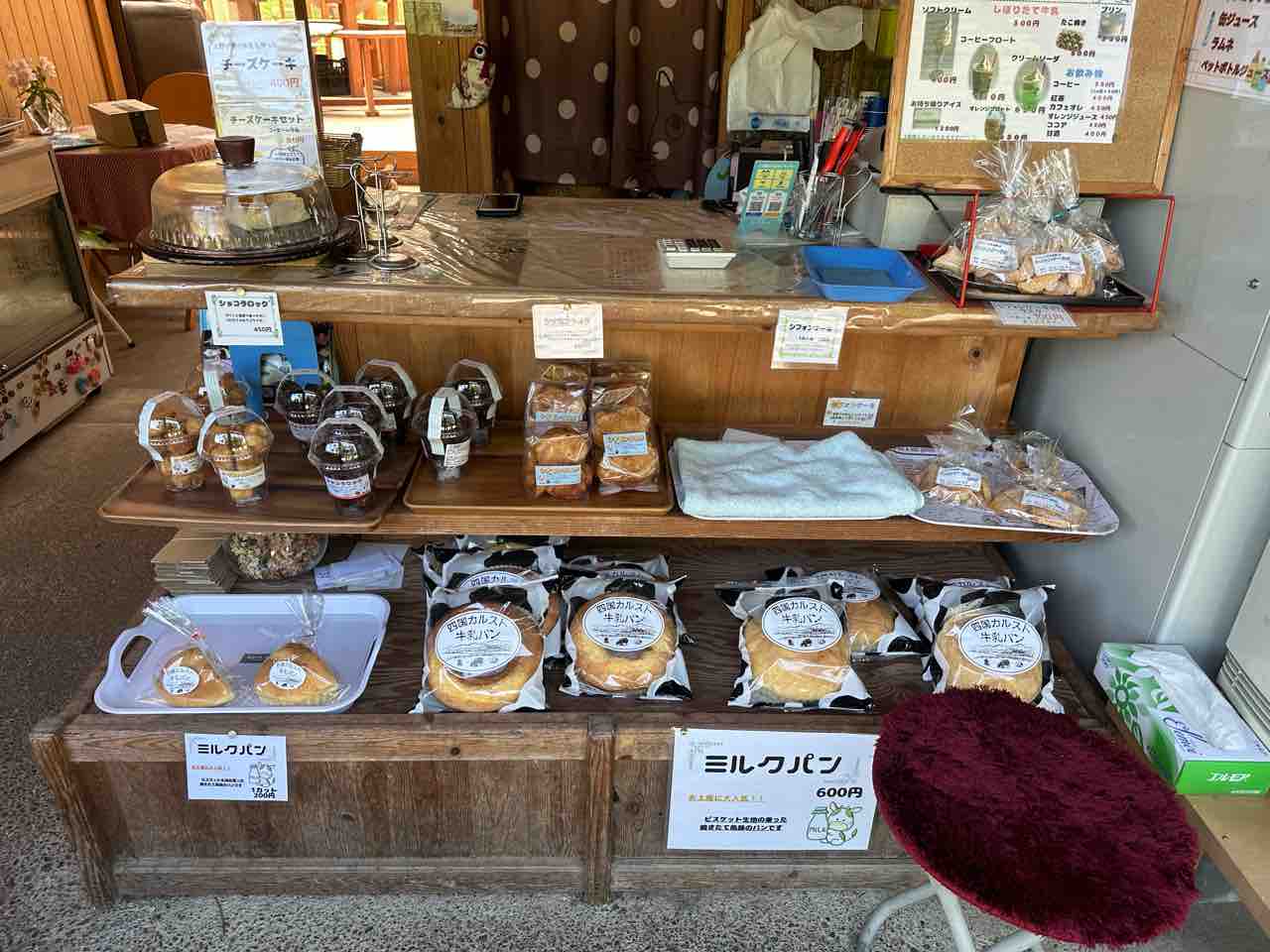 カウンター下の棚には、ふわっとしたパンにクリームをたっぷり詰めた「ミルクパン」や、香ばしいラスク、四国カルスト牛乳パンなどが整然と並べられており、どれも地元の素材を生かした手づくり品ばかり。木の棚やレジ周りの雑貨も素朴であたたかく、ほっと落ち着ける雰囲気です。