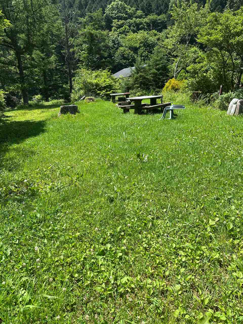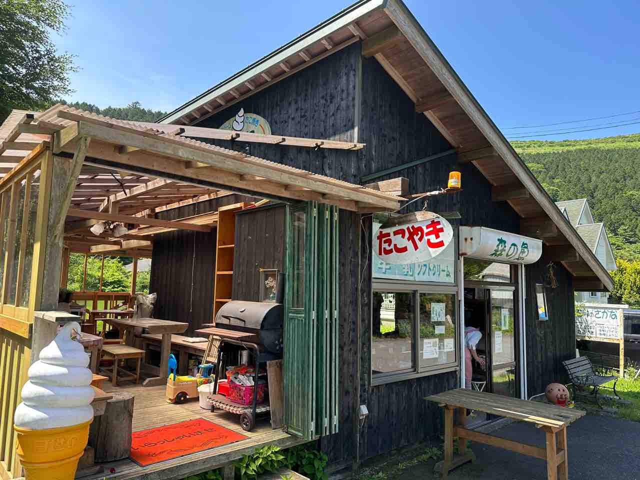 玄関先には「ソフトクリーム」や「たこやき」の手書き看板が並び、どこか懐かしさを感じさせてくれます。木製のベンチやおもちゃ、小さなグリルが並ぶウッドデッキのテラスは、まるで誰かの山小屋に招かれたような温かさ。