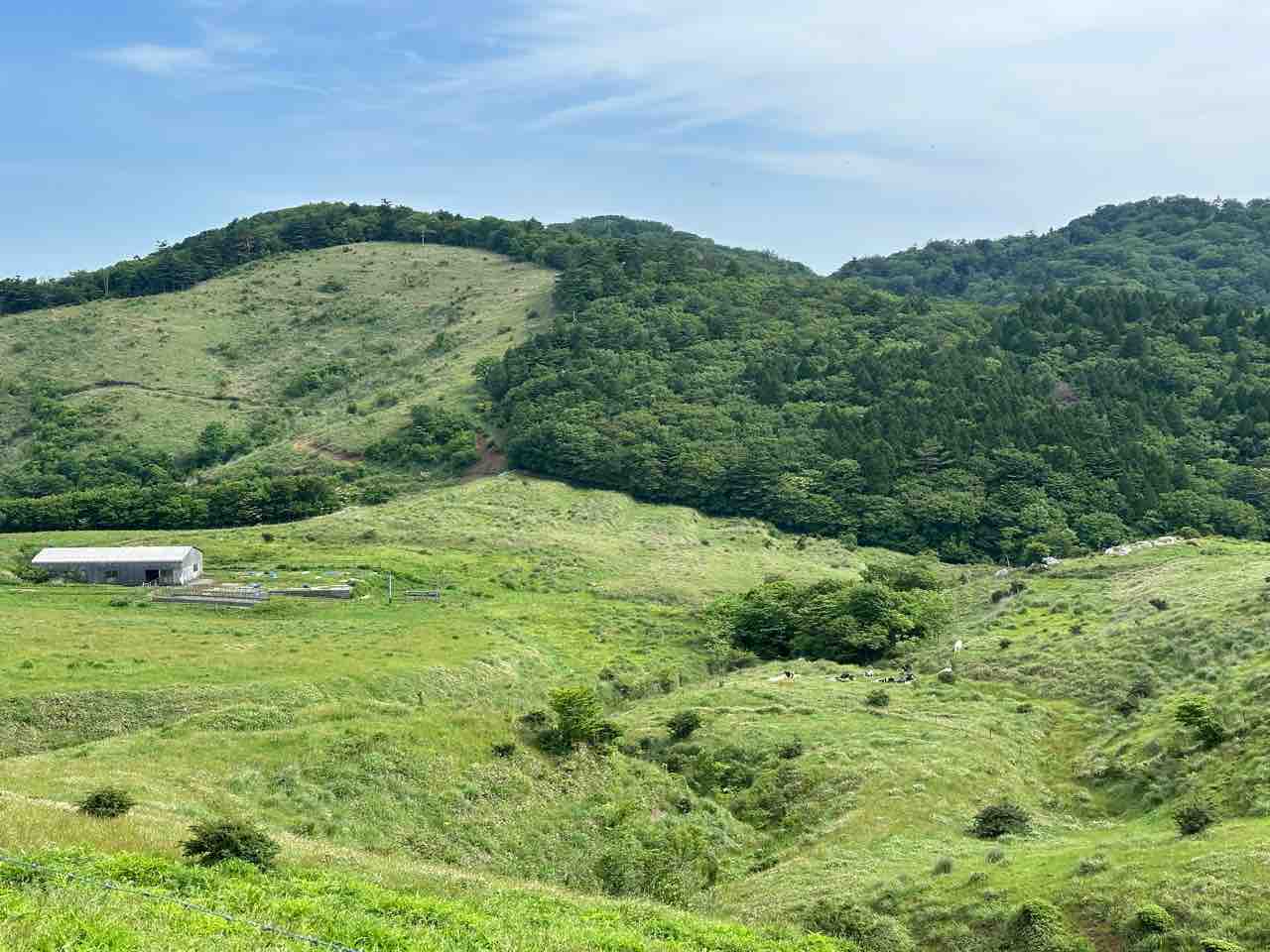 緩やかな坂道を歩いていくと、右手には広々とした牧草地が広がり、のどかに放牧された牛たちの姿も遠くに見えて、まるで絵本の世界に迷い込んだよう。