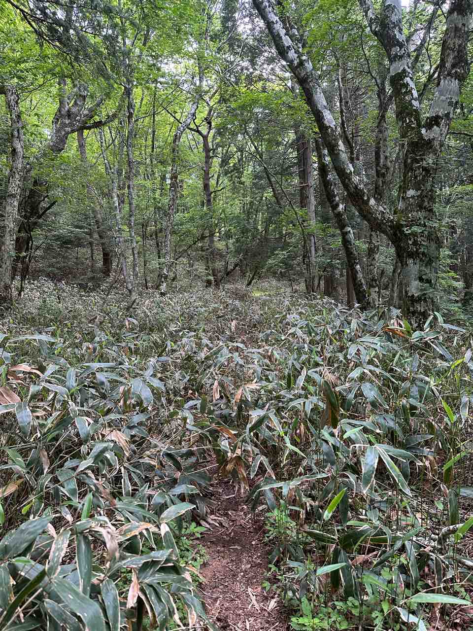 足元は膝下ほどの笹の葉に覆われ、ふかふかとした森の道が続いています。全長約1.2キロメートルの遊歩道は整備されていますが、近年訪れる人が減ってきたのか、道を覆うように笹が茂っている場所もありました。