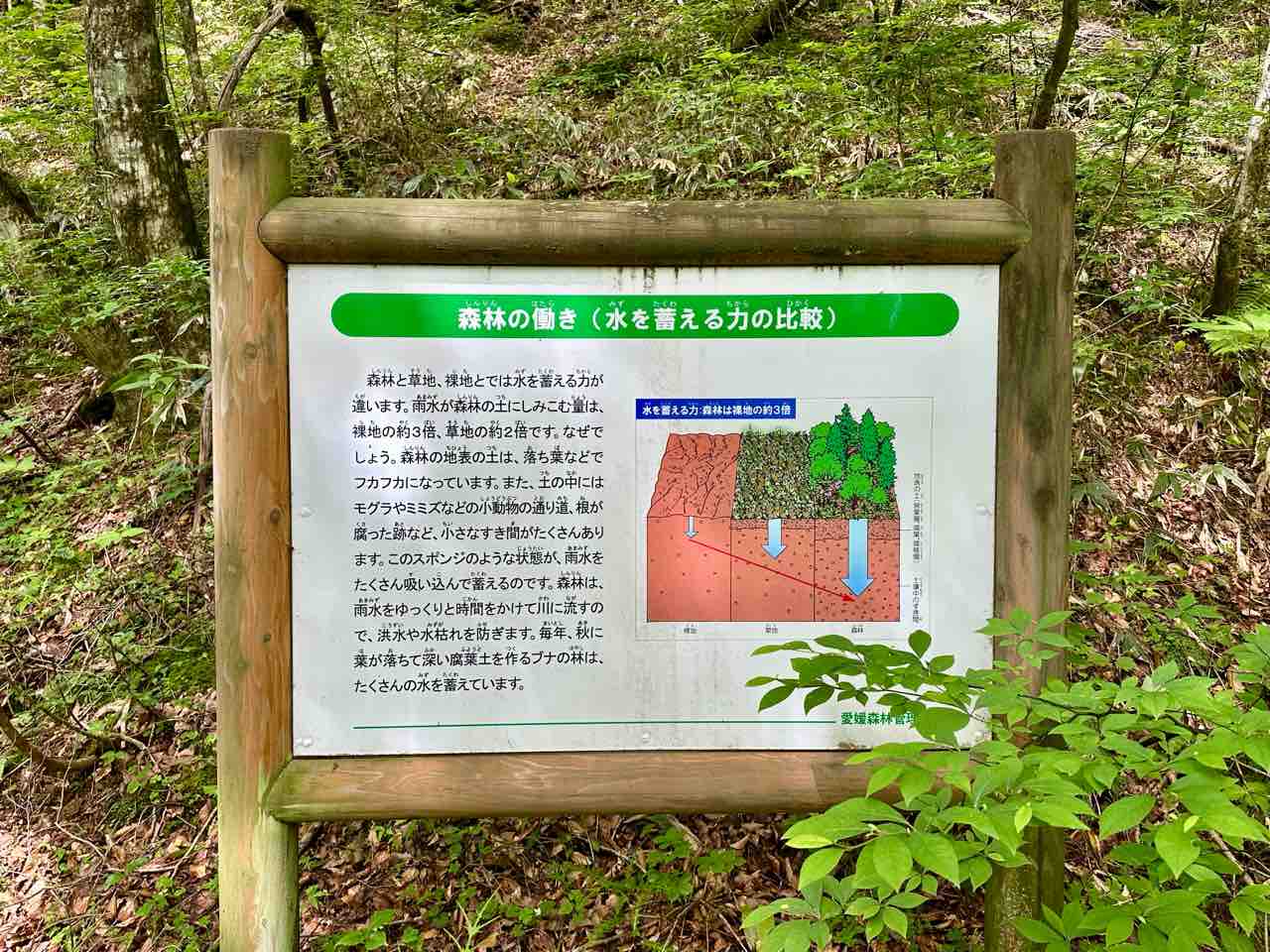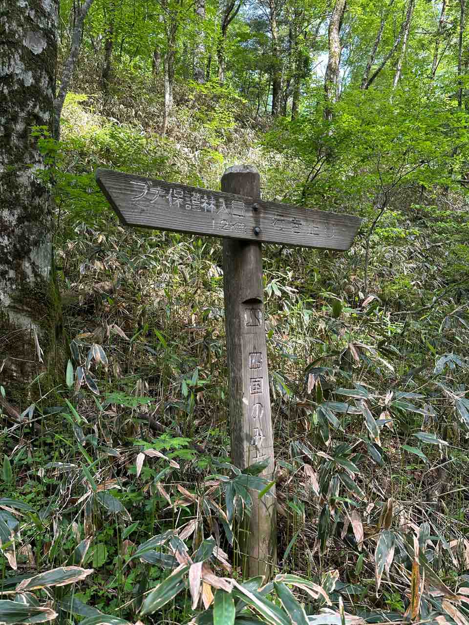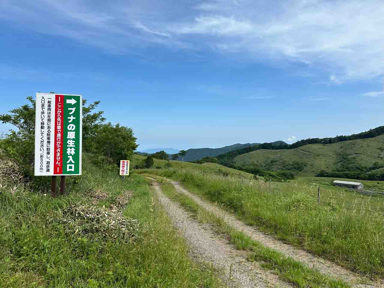 駐車場の近くには、「ブナの原生林」入口を示す看板があり、そこから約500メートル下っていく道が始まります。