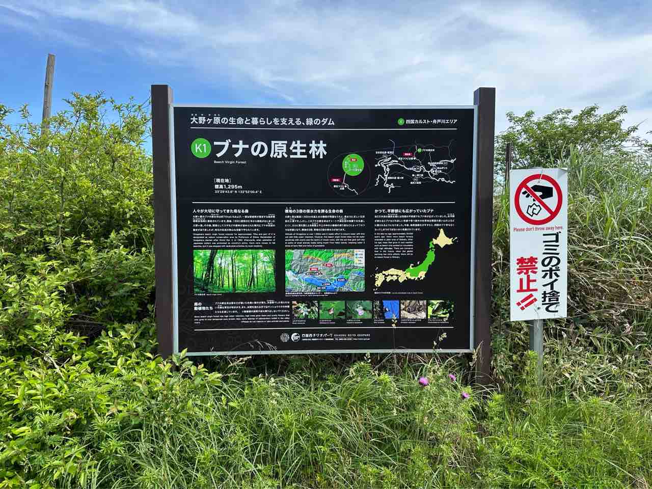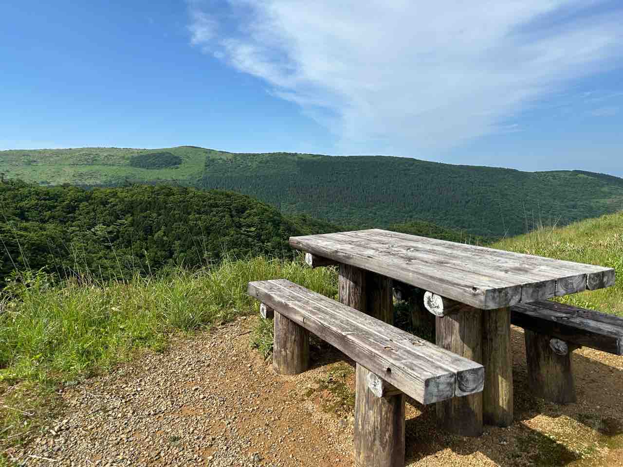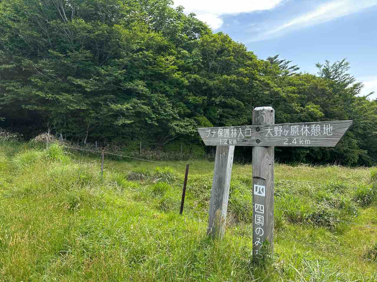 「ブナの原生林」へは、大野ヶ原の「ミルク園」前の交差点から、「ブナの原生林」に向かう道を約1.9キロメートル進むと小さな駐車場があります。そこにはベンチも設置されていて、のんびりと「源氏ヶ駄場」の景色を眺められます。