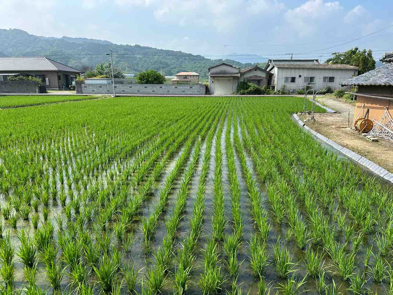 南側には青々とした水田が広がり、松山市郊外ならではの穏やかな景色が楽しめます。