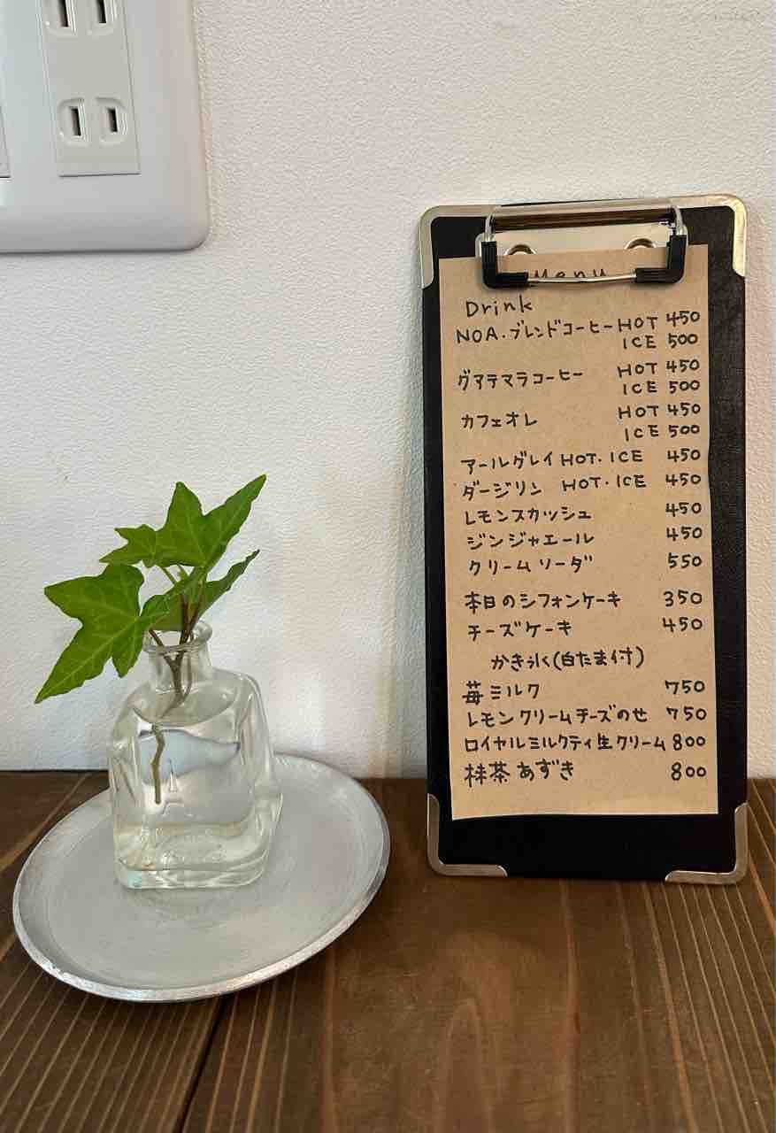 クリップボードに丁寧に手書きされたメニューには、NOA.ブレンドコーヒーやグアテマラコーヒー、カフェオレなどのコーヒー類が揃い、ホットでもアイスでも楽しめます。
