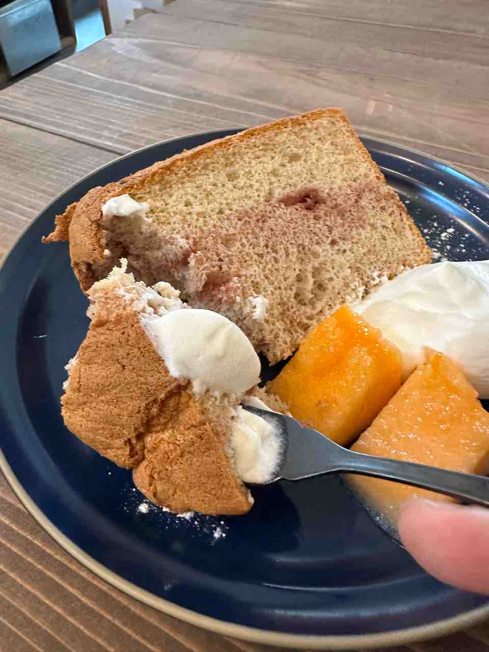 運ばれてきたシフォンケーキはふわふわで、ほのかないちごの甘酸っぱい香りが広がり、ひと口食べると優しい甘みとしっとりとした口どけが感じられます。添えられた生クリームは甘さ控えめで、シフォンケーキの味を引き立ててくれます。