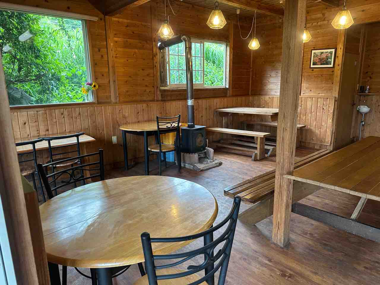 木の香りに包まれた店内は、まるで山小屋のようにほっと落ち着ける癒し空間です。木目を活かした壁や床、梁が温かみを感じさせ、窓から入るやわらかな自然光が穏やかさを演出しています。