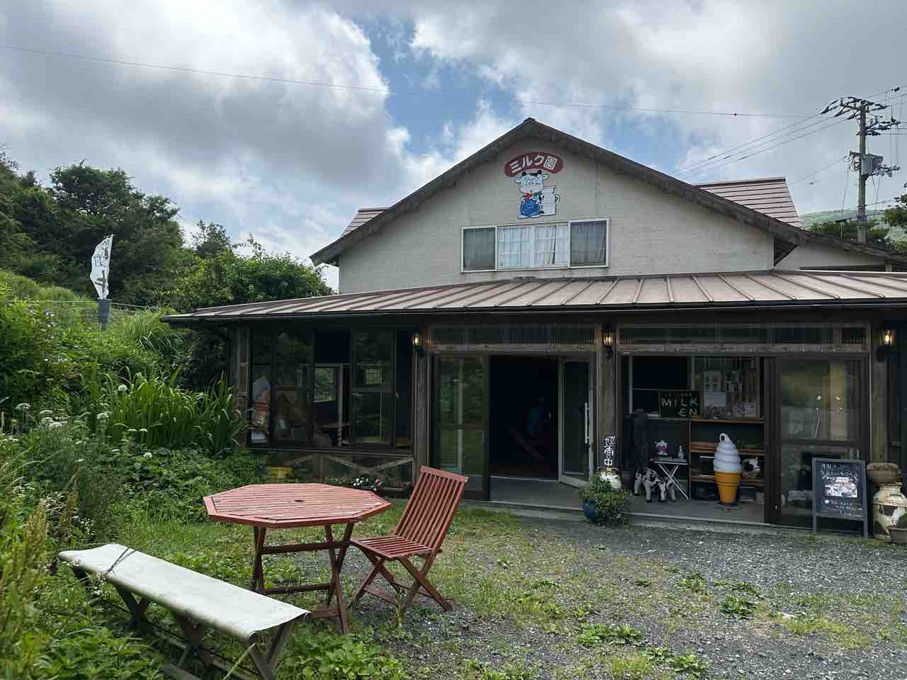 「ミルク園」は、どこか懐かしい木造の三角屋根と牧場らしい牛のイラストが目印の、自然と調和する高原カフェです。草花に囲まれた入り口には白いベンチと赤いテーブルが置かれ、訪れる人を優しく迎えてくれます。
