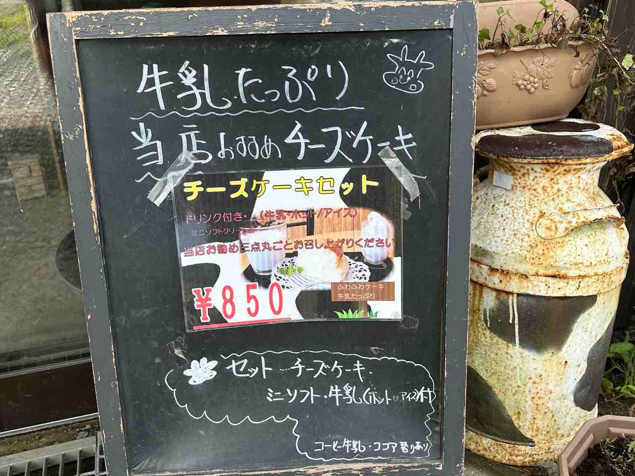 看板メニューのチーズケーキは、しっとり濃厚で口どけなめらか。単品450円、ソフトとミニ牛乳が付いたセットは850円で、乳製品好きにはたまらない組み合わせです。