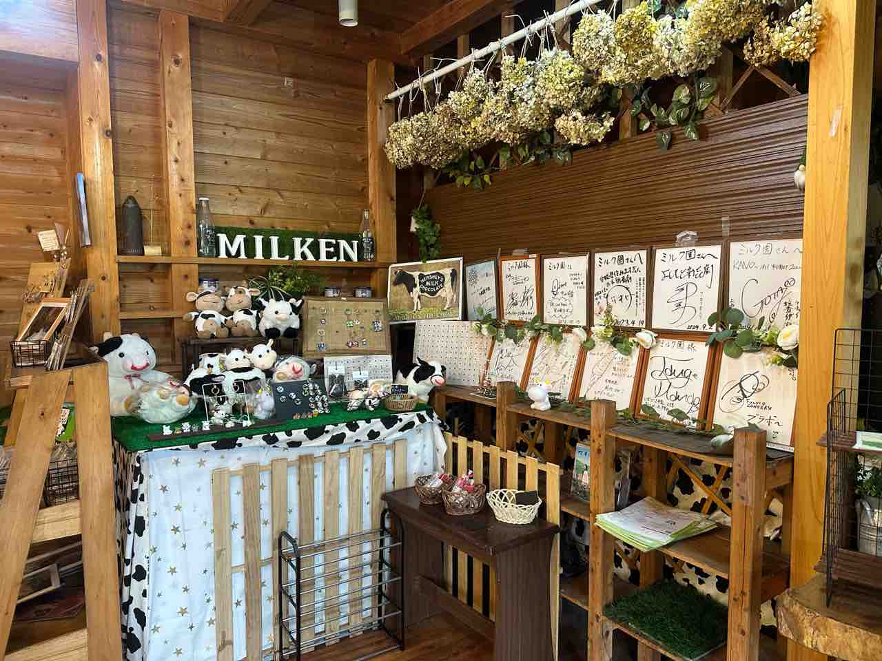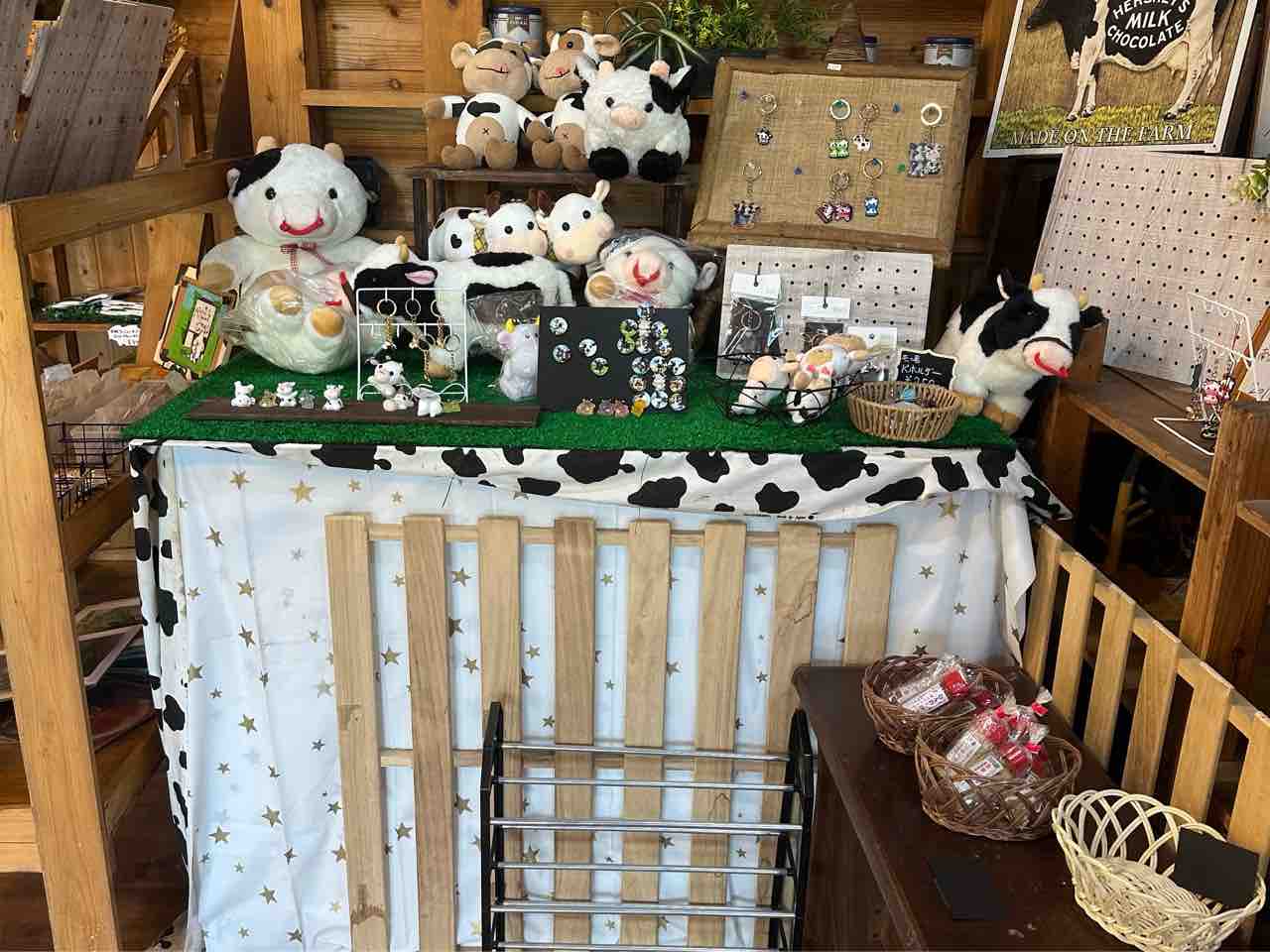 中央に置かれた薪ストーブは、寒い季節に訪れる人の体を優しく温め、心も和ませてくれる存在。丸テーブルやベンチ席が配置されていて、家族連れや友人同士でもゆっくりくつろげます。奥には「MILKEN」と書かれた可愛い物販コーナーがあり、牛のぬいぐるみや牧場グッズが並び、訪れた人のお土産選びも楽しいひととき。
