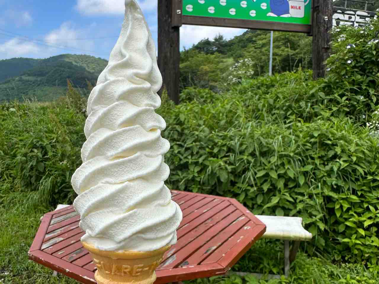 牧場の新鮮な牛乳を使っているからこそ、後味はさっぱりしていてくどさがなく、青空の下で食べればさらに格別。赤いテーブルに座って高原の風を感じながら味わう時間は、都会では味わえない至福のひとときです。食べ終わる頃には「もう一つ食べたい!」と思ってしまうほどの美味しさ。