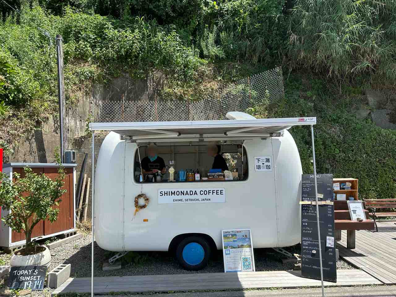 白く塗られたトレーラーを改装した可愛らしい移動式カフェ。無人駅の賑やかさと瀬戸内の海風に包まれ、まるで物語に出てくる秘密基地のような存在感を放っています。