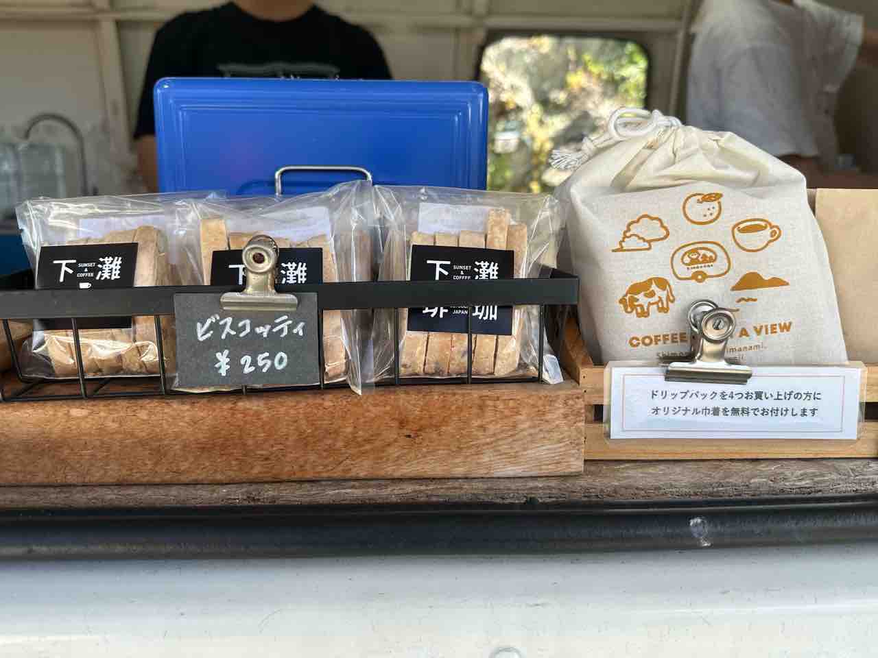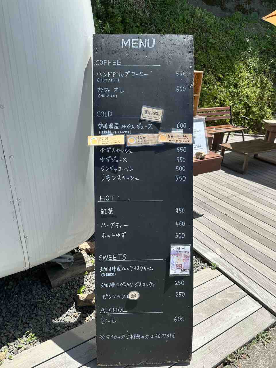 寒い日にはホットゆずやハーブティー、紅茶で体を温めながら瀬戸内海を眺めるのもおすすめ。スイーツメニューにはビスコッティやアイスクリームがあり、コーヒーのお供に嬉しいラインナップです。 マイカップ持参で50円引きというエコな取り組みも、旅人の心を温めてくれます。