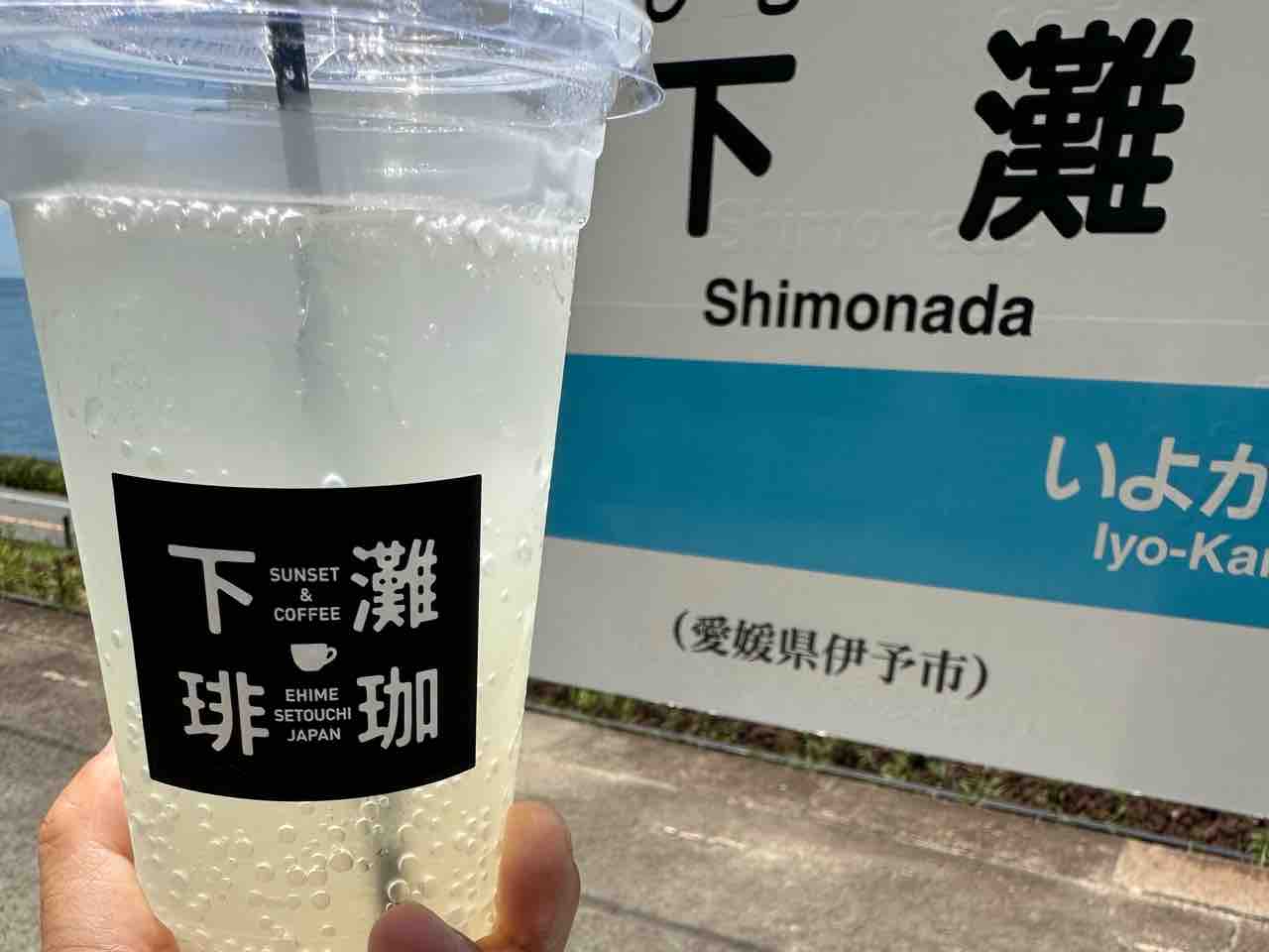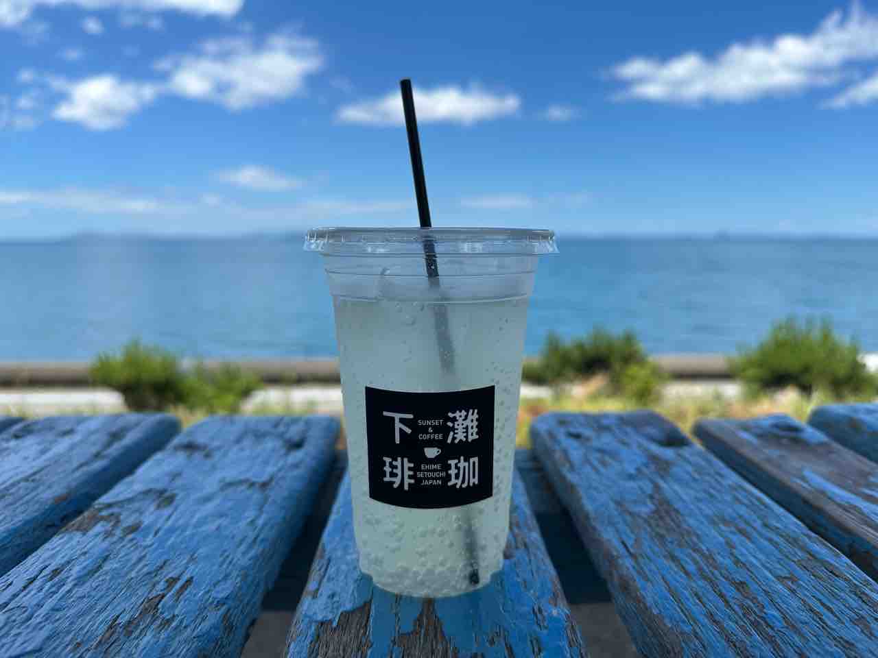 ロゴ入りカップを片手に向かうのは、すぐそばの下灘駅の青いベンチ。瀬戸内海と真っ青な空を背景に、潮風に吹かれながら味わえば、まるで映画のワンシーンのようです。