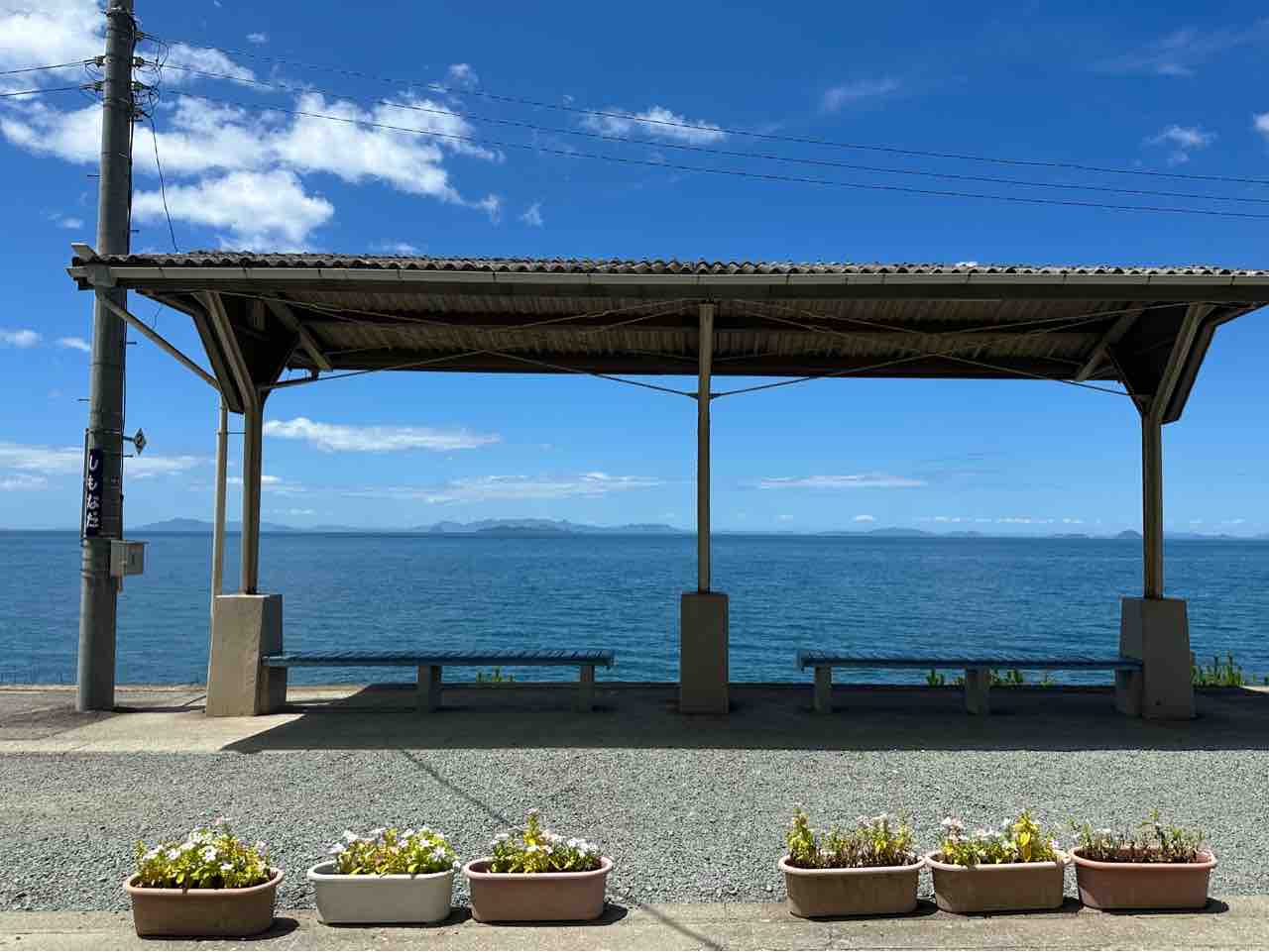 愛媛県伊予市双海町大久保にある「下灘珈琲」は、JR四国予讃線の無人駅・下灘駅の真正面にひっそりと佇む、小さなオープンエアカフェスタンドです。