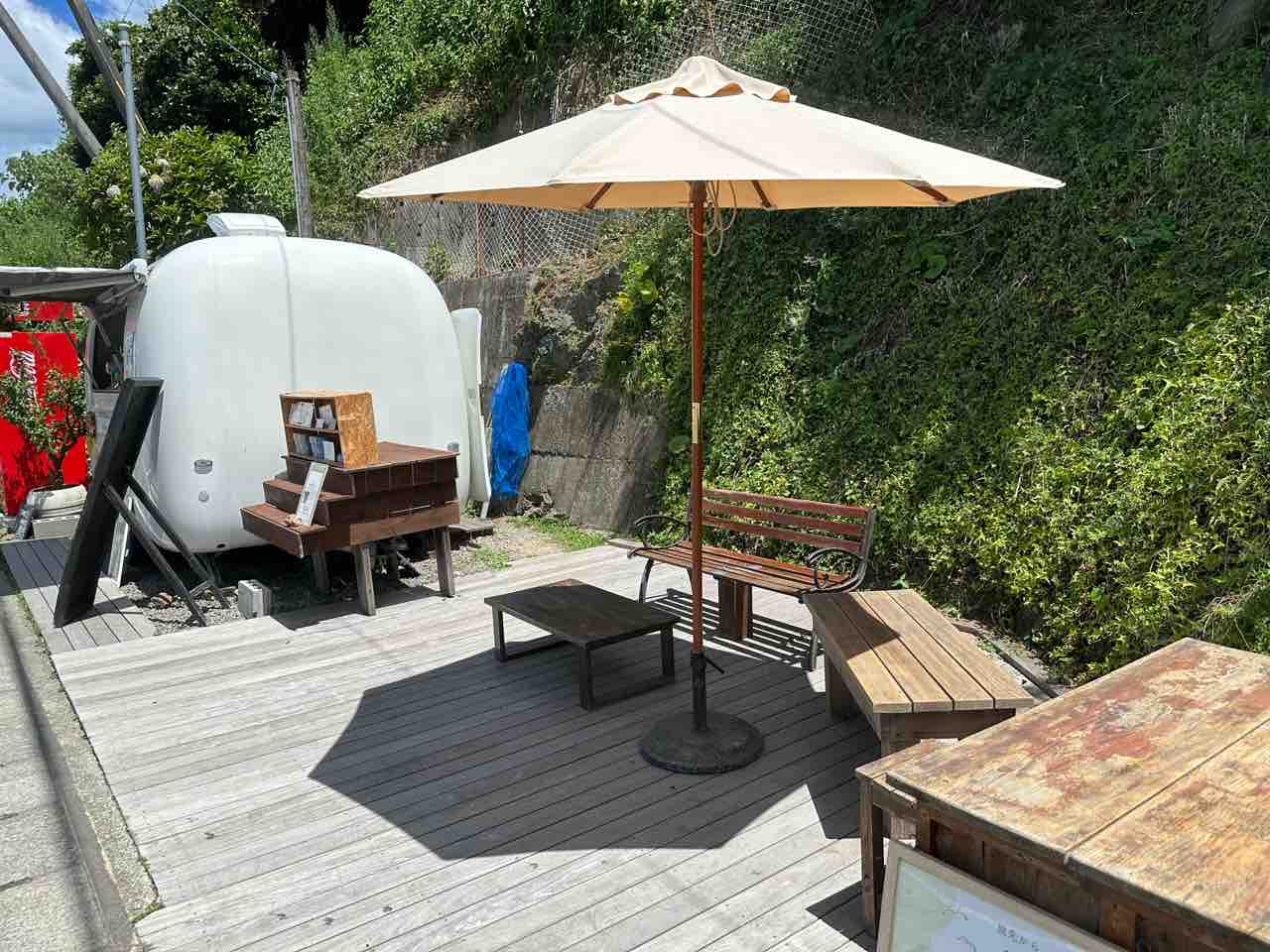 トレーラーのすぐ隣には、木の温もりを感じるウッドデッキのテラスが設けられていて、ベンチやローテーブル、大きなパラソルが並びます。 周りを囲むのは石垣と青々とした山の緑。