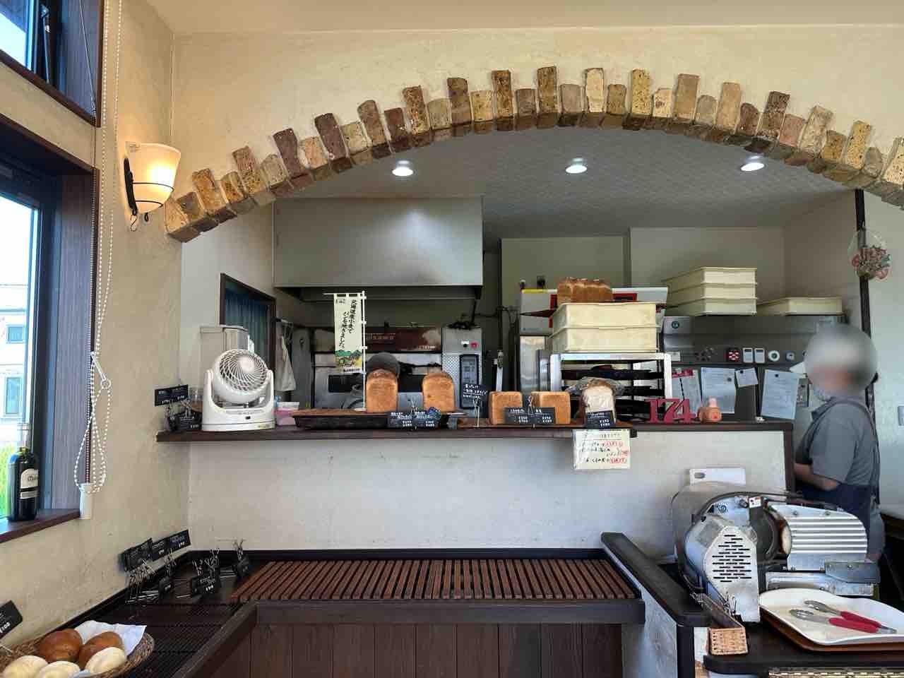 奥に見えるレンガ調のアーチを抜けると、パン作りに励む店主さんの姿が見え、その真摯な姿勢に自然と信頼が湧きます。