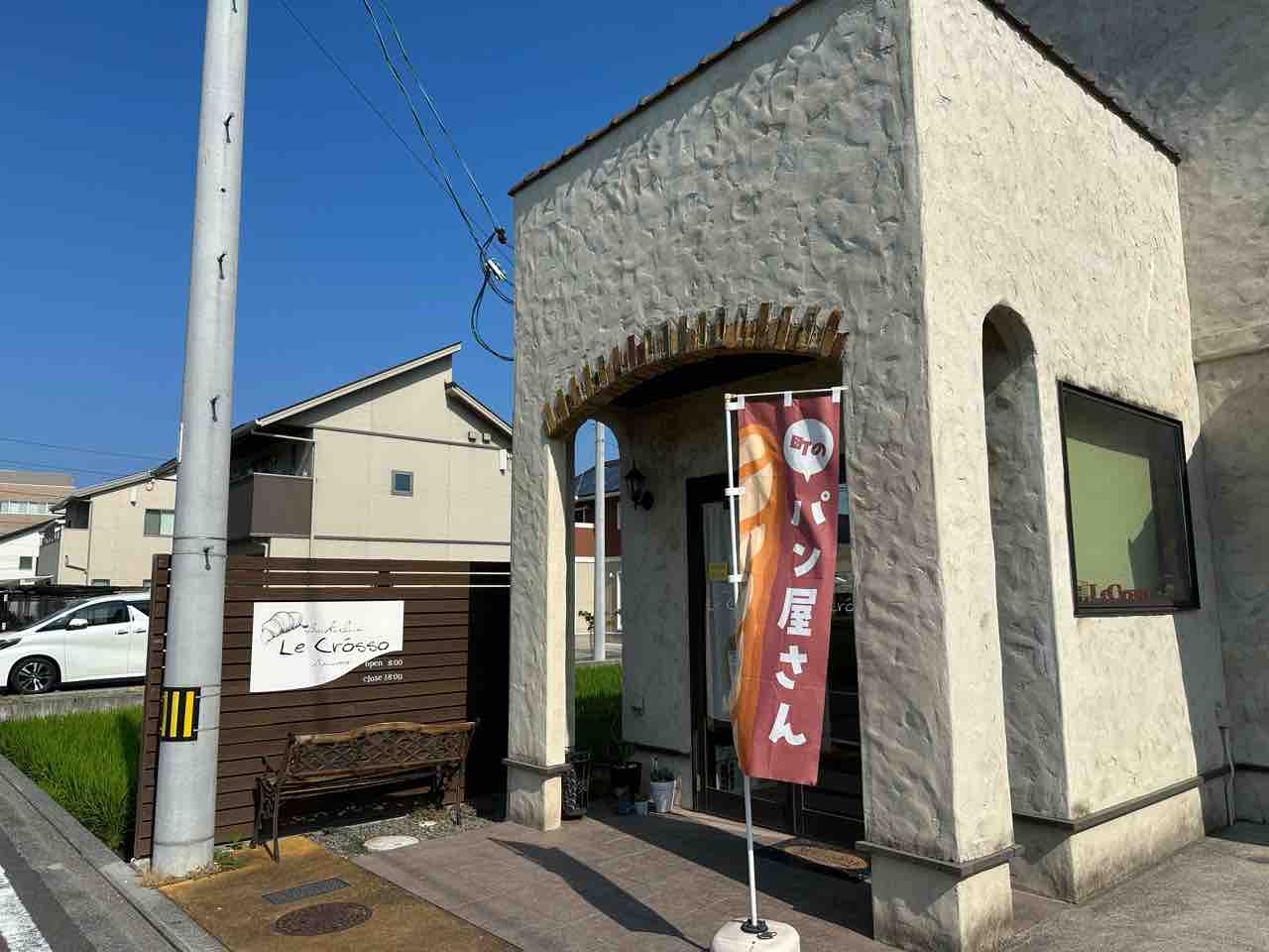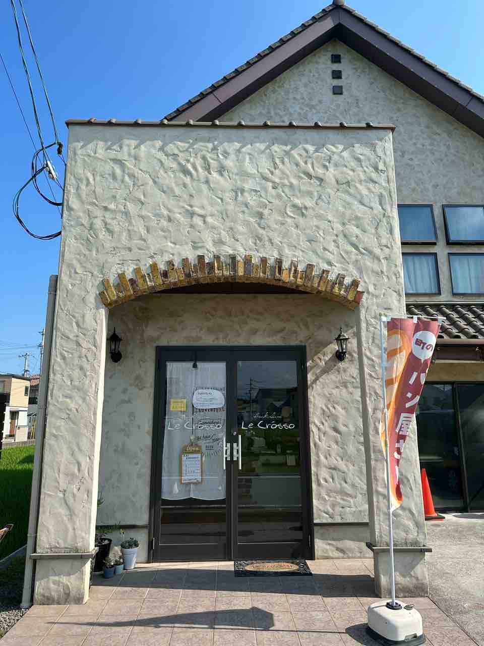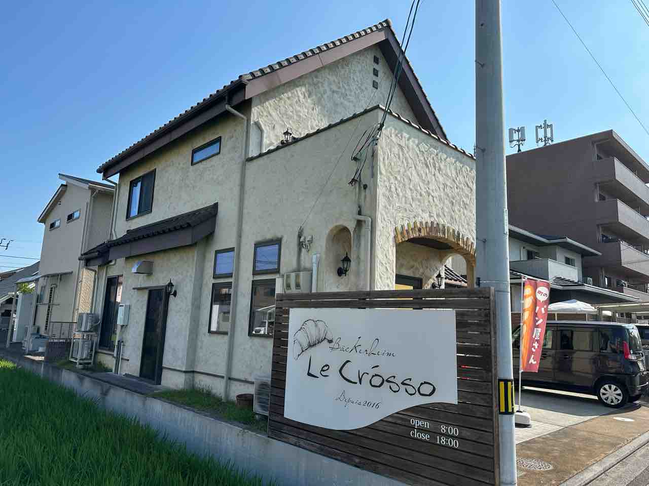 店前には赤い「パン屋さん」ののぼり旗が風に揺れ、木製フェンスの白い看板には「Backerei Le Crosso」と文字が可愛らしく、クロワッサンのイラストも思わず微笑んでしまうポイント。営業時間が記された看板を見て、ふと車を停めて立ち寄りたくなる人も多いはずです。