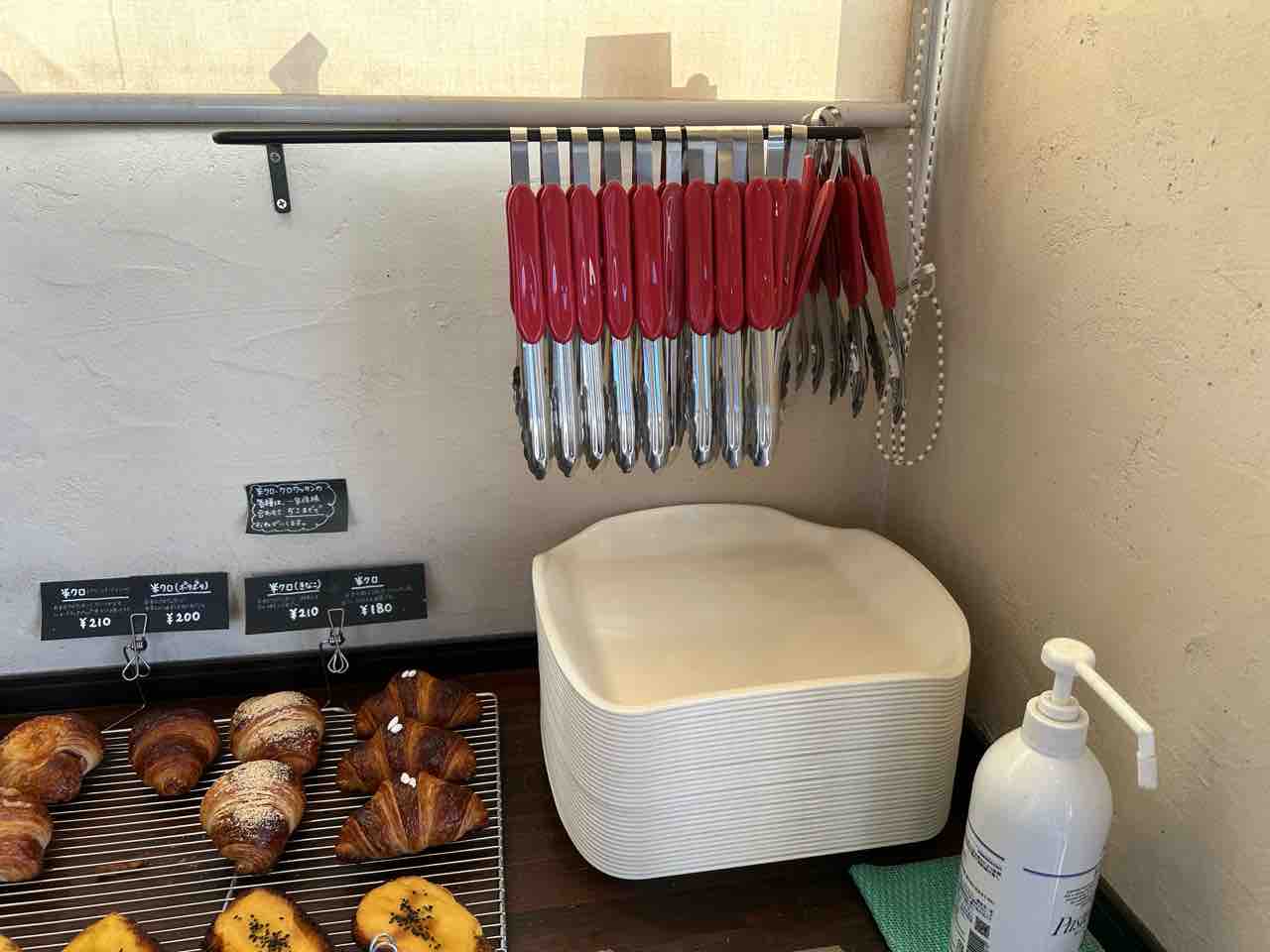 入口すぐ横には、衛生的に管理されたトングとトレイが並べられ、安心してパン選びを楽しめます。カウンターには焼きたてのパンがずらりと並び、クロワッサンやデニッシュ、食パンなど、どれも店主の丁寧な仕事が伝わってくる美しい焼き色。