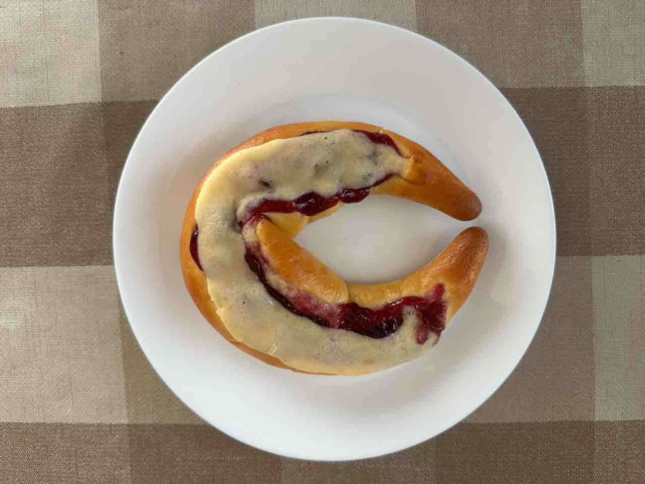 「クロッソのC」は、店名の頭文字をかたどった可愛らしい形が印象的な一品です。しっとりとしたパン生地に、甘酸っぱいブルーベリージャムとまろやかなクリームチーズがたっぷりのっています。
