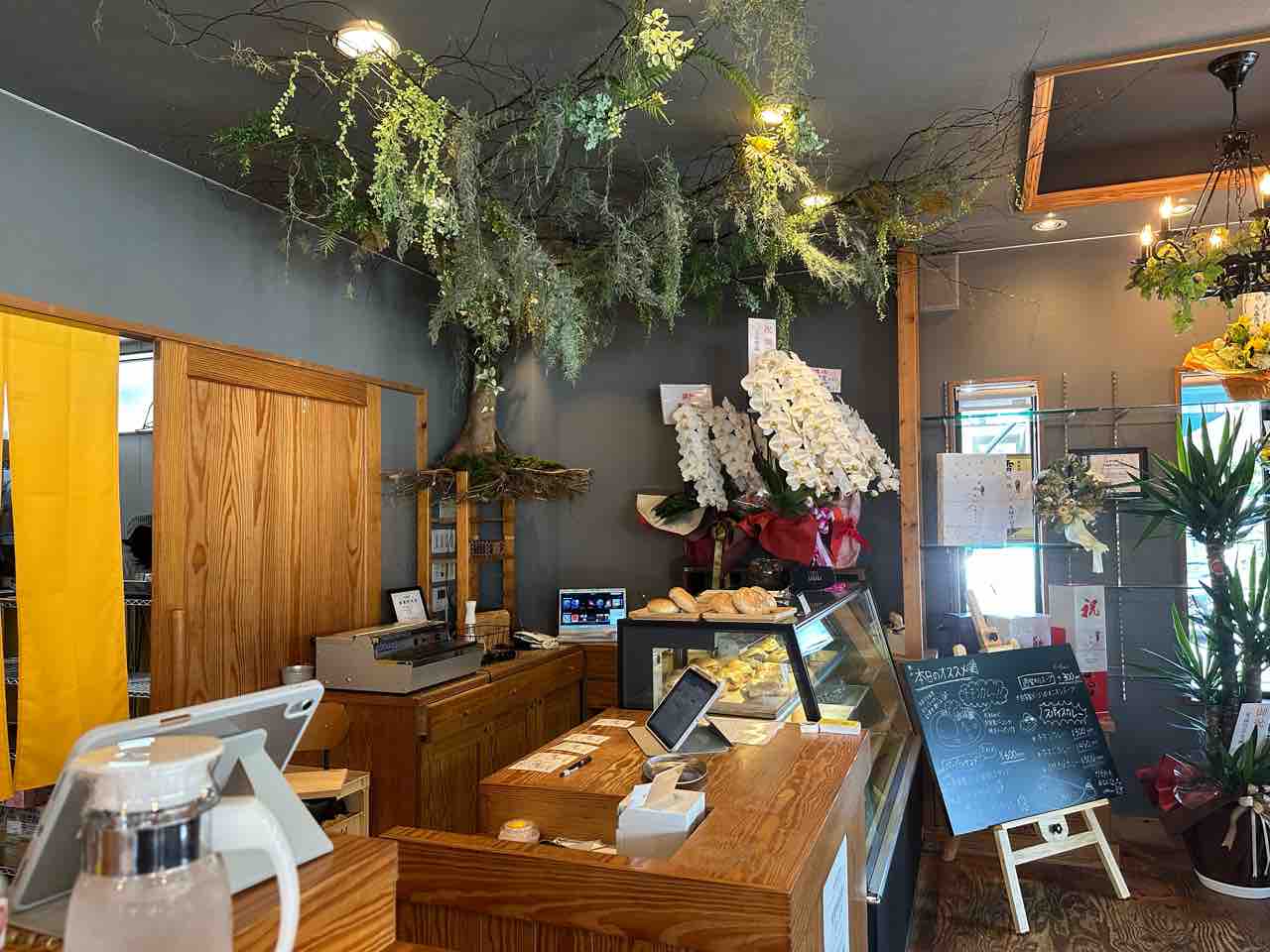 レジ上には吊るされた植物が飾られ、天井から生えているかのような独特の演出が幻想的な雰囲気を醸し出します。