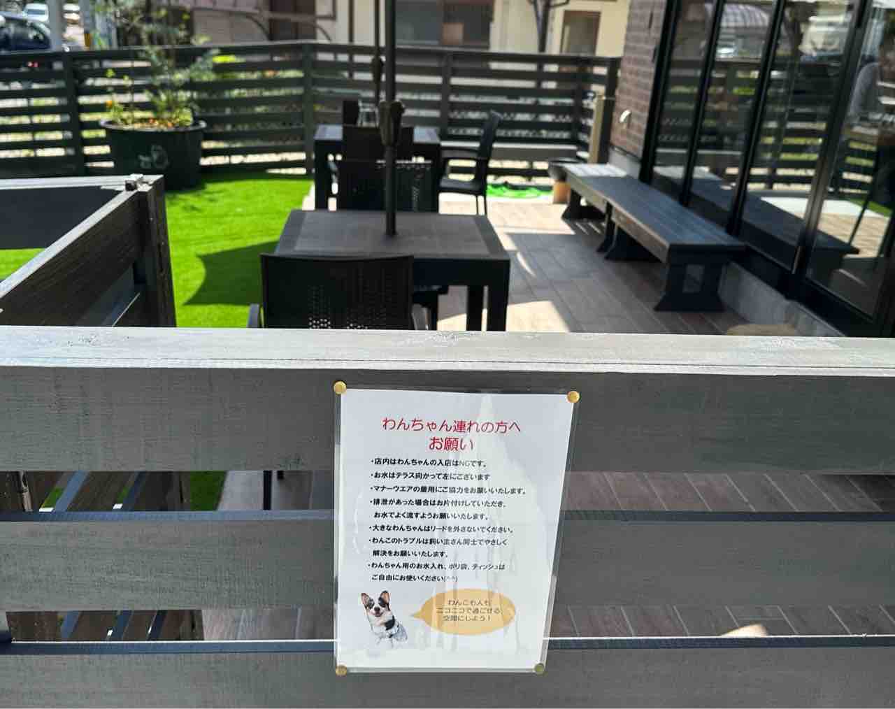 テラスには「わんちゃん連れの方へお願い」が掲示されており、ルールを守れば愛犬と一緒にカフェタイムを過ごせます。