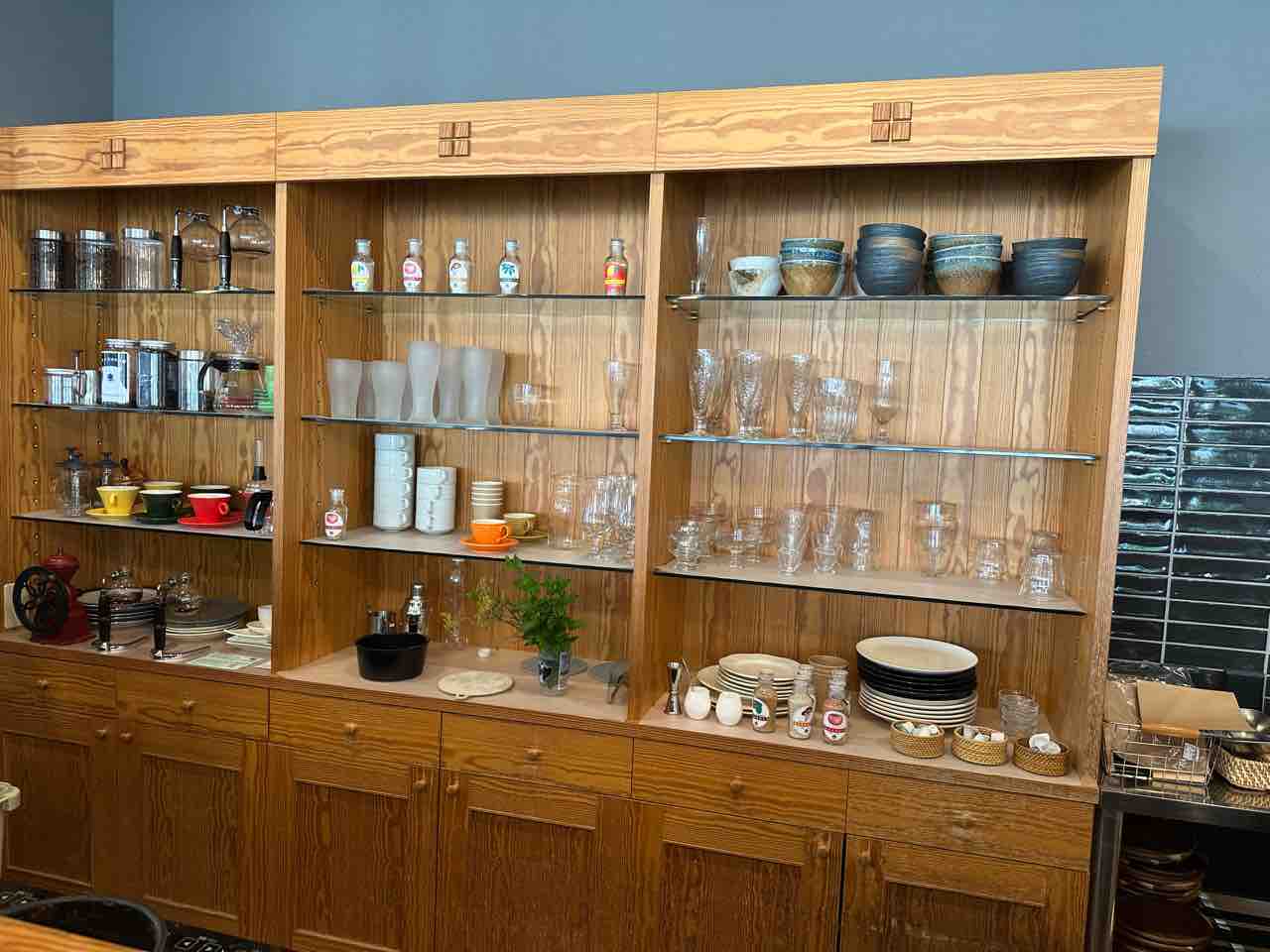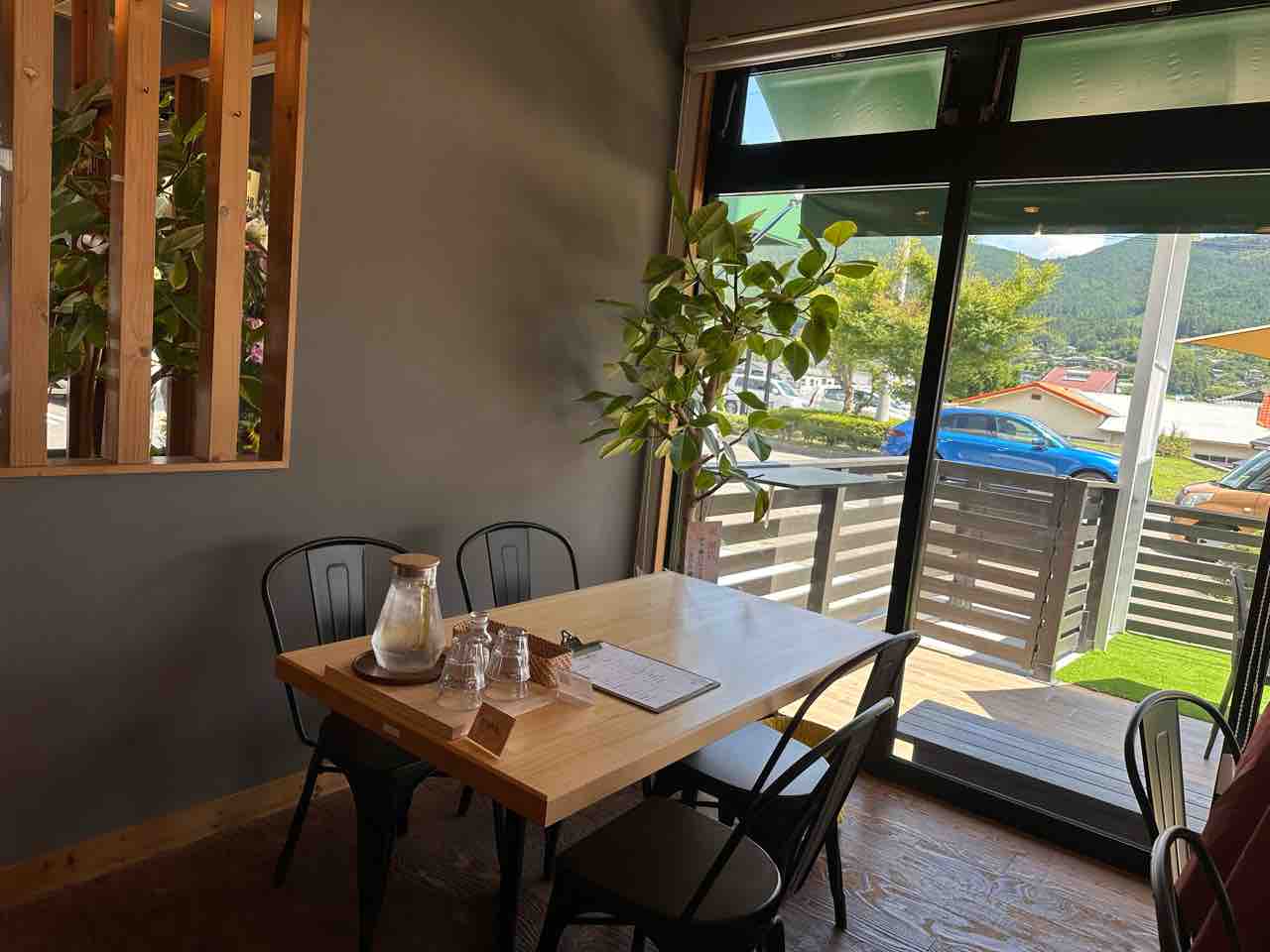 窓から差し込む柔らかな自然光が店内を明るく照らし、外に広がる久万高原町の街並みを楽しめるのも魅力。ディスプレイ棚には素朴な器や食器が並び、料理がより美味しく感じられる工夫もされています。
