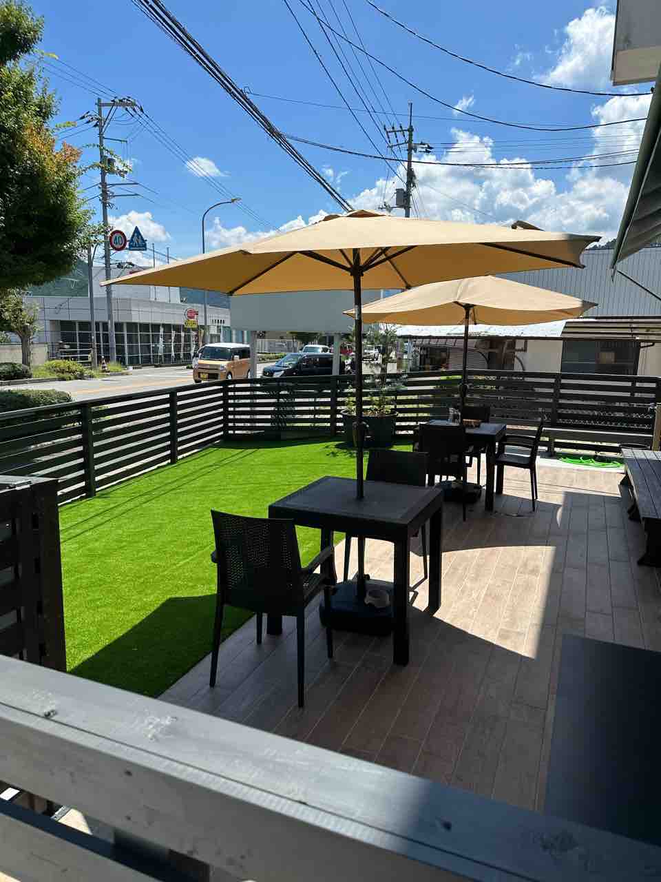 店先には広々としたテラス席があり、緑の人工芝と大きなパラソルが開放的な雰囲気を演出。特に晴れた日には、自然の光や風を感じながらゆったり食事を楽しむことができます。
