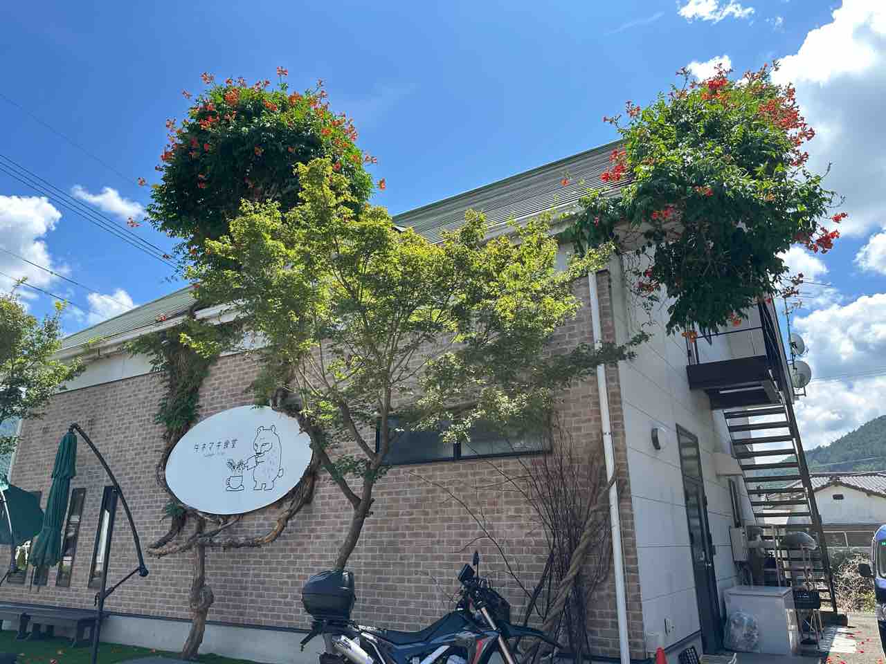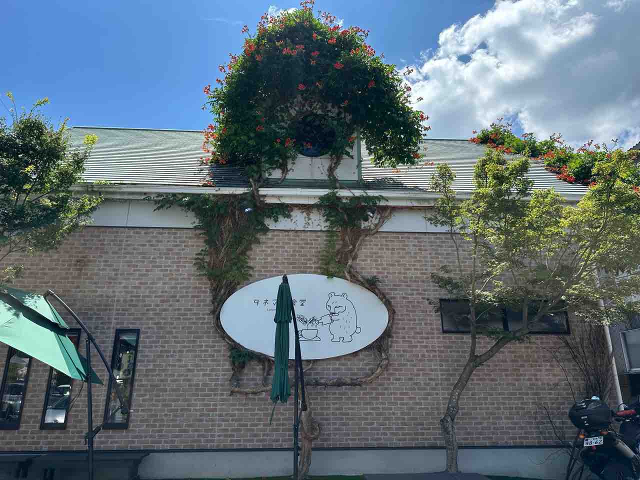 白壁とレンガ調を組み合わせたナチュラルで温かみのあるデザイン。通り沿いに建ち、初めて訪れる人でも気軽に立ち寄れる親しみやすさがあります。青空の下で輝く店名の看板が目を引き、訪れる人の心をワクワクさせてくれます。