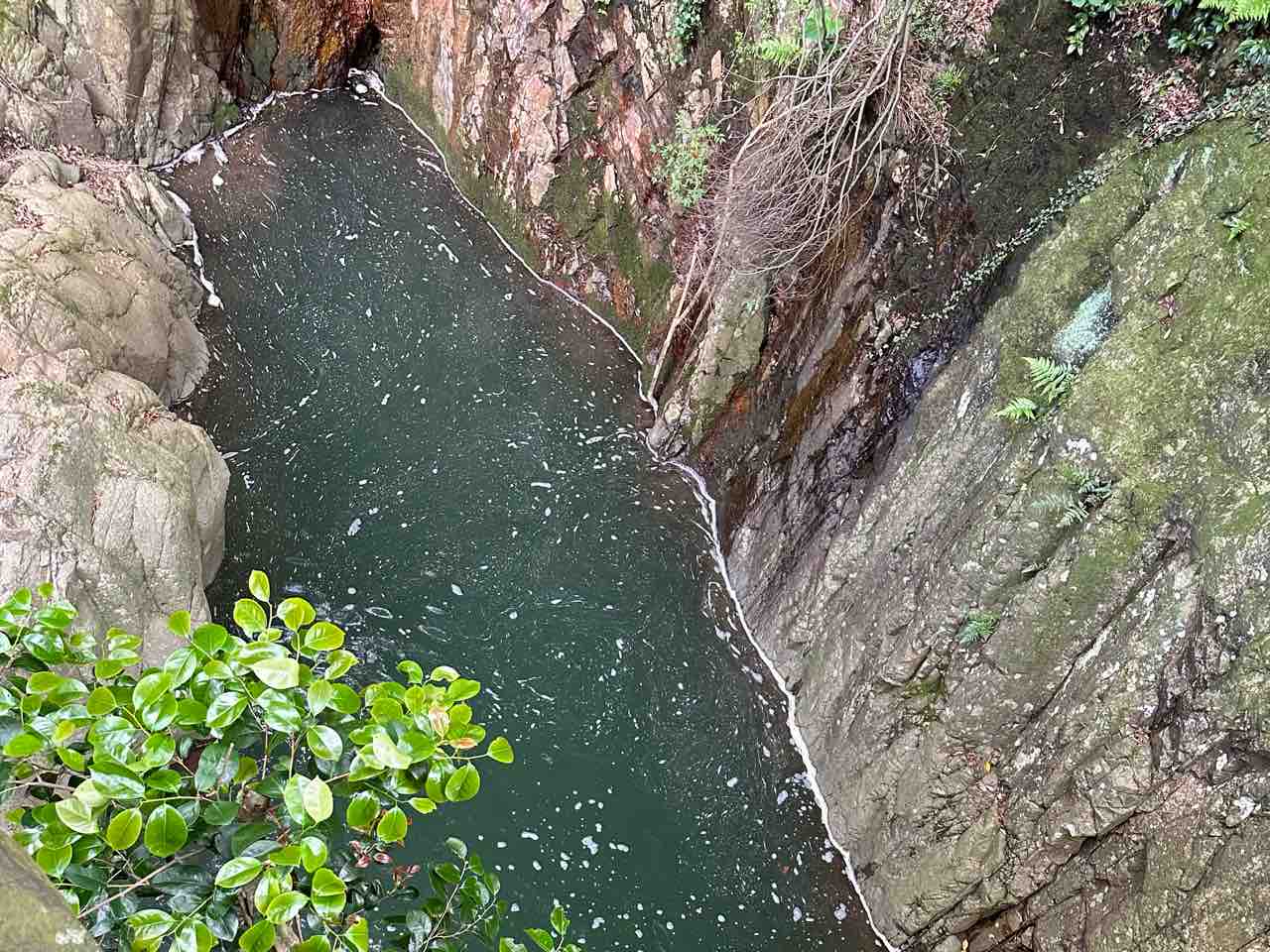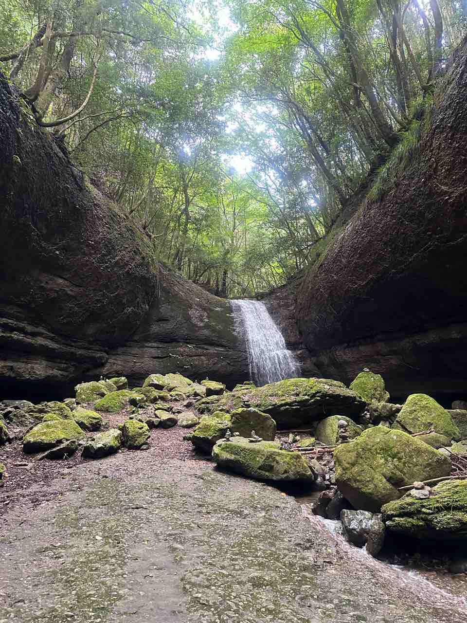 渓谷奥の滝と左右に迫る巨大な岩壁は、まるで龍の体内を歩くような不思議な光景を生み出します。