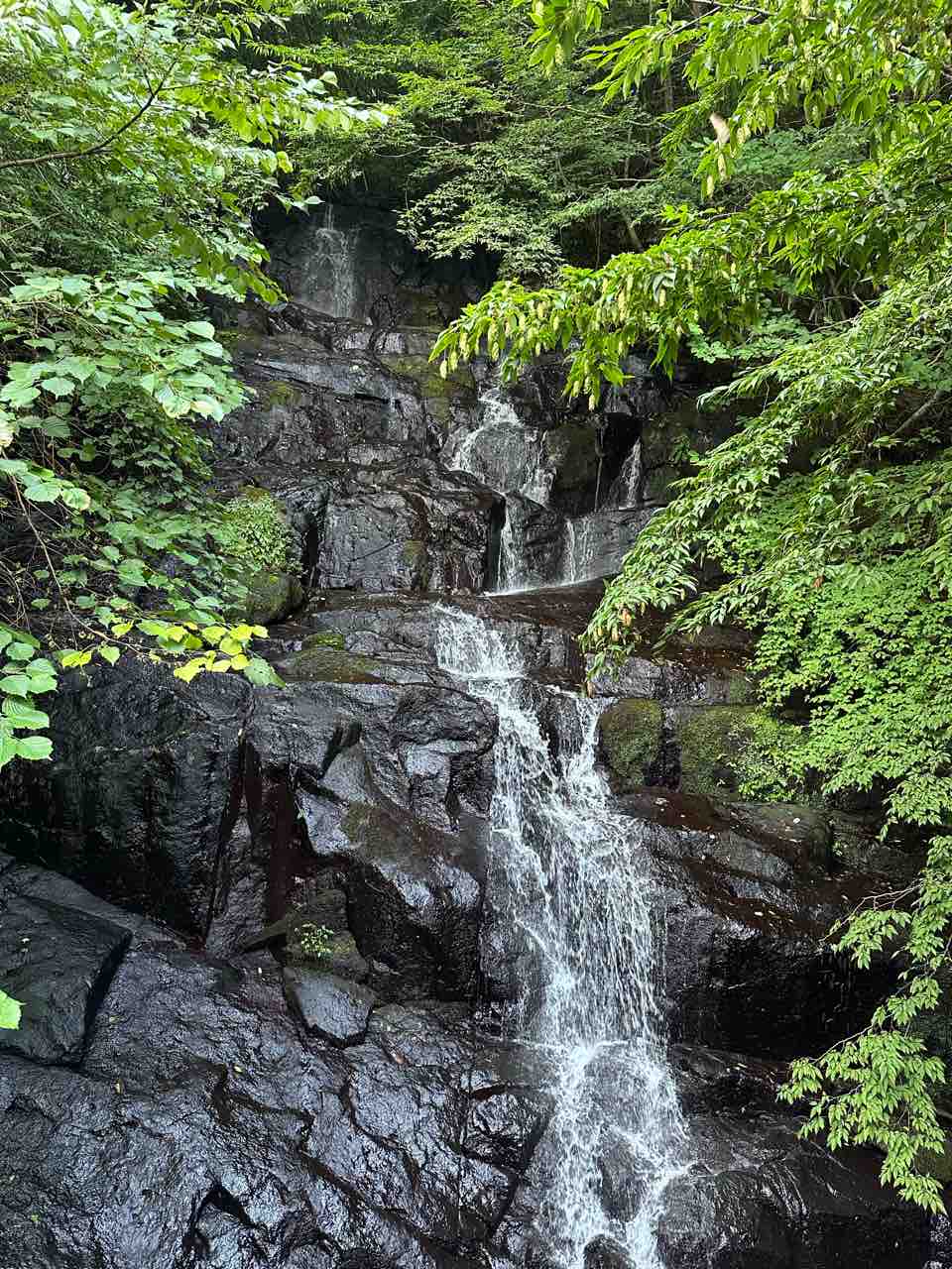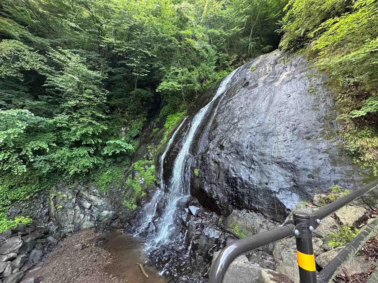 皿ヶ嶺の清流が育む「雨滝」は、岩肌を伝って雨のように細やかな筋を描きながら流れ落ちる姿が印象的です。水量は季節ごとに変化し、梅雨や雪解けの頃には一層の迫力を見せ、夏は優しい水しぶきが涼をもたらします。