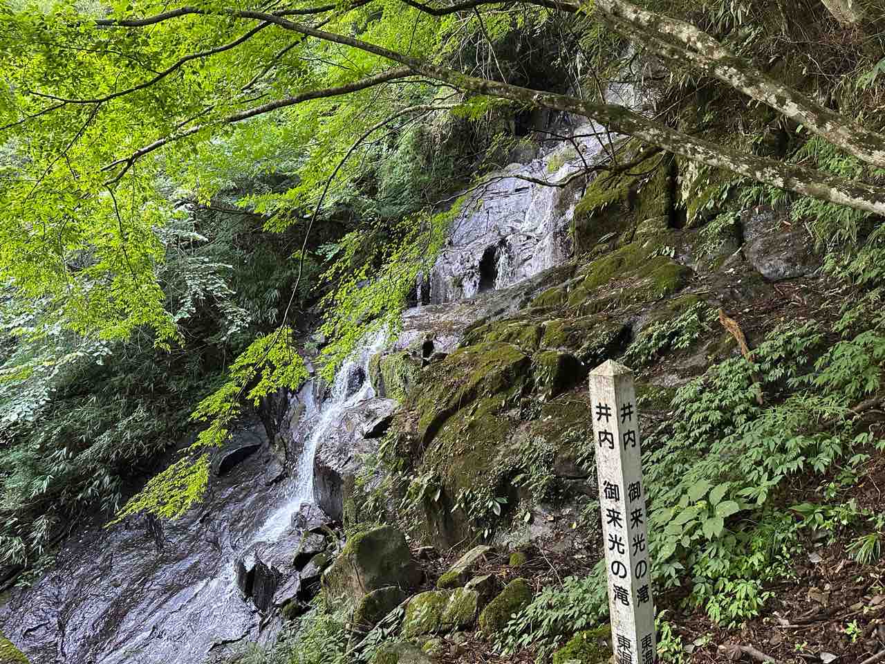 「井内御来光の滝」は、落差約67メートルを誇る東温市を代表する名瀑です。その名の通り朝日を浴びた姿が美しいと伝えられていますが、実際には滝の前方に木々が生い茂り、光が差し込む時間は限られています。