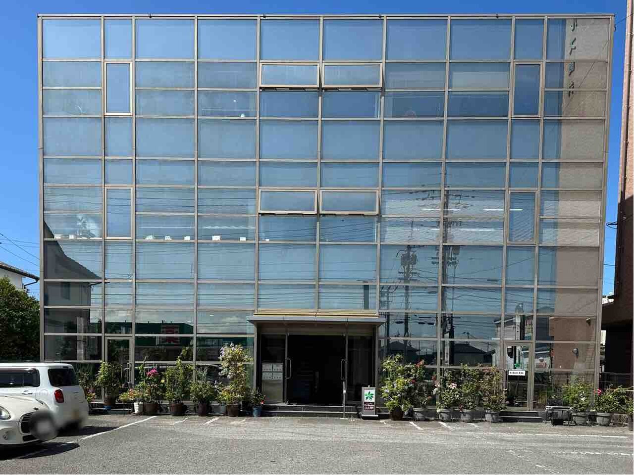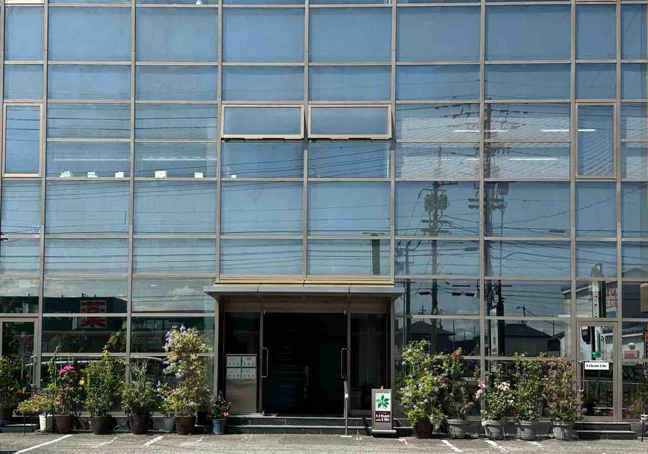 建物は全面ガラス張りで、四角く切り取られた窓が青空や街並みを映し込み、洗練された雰囲気を漂わせています。