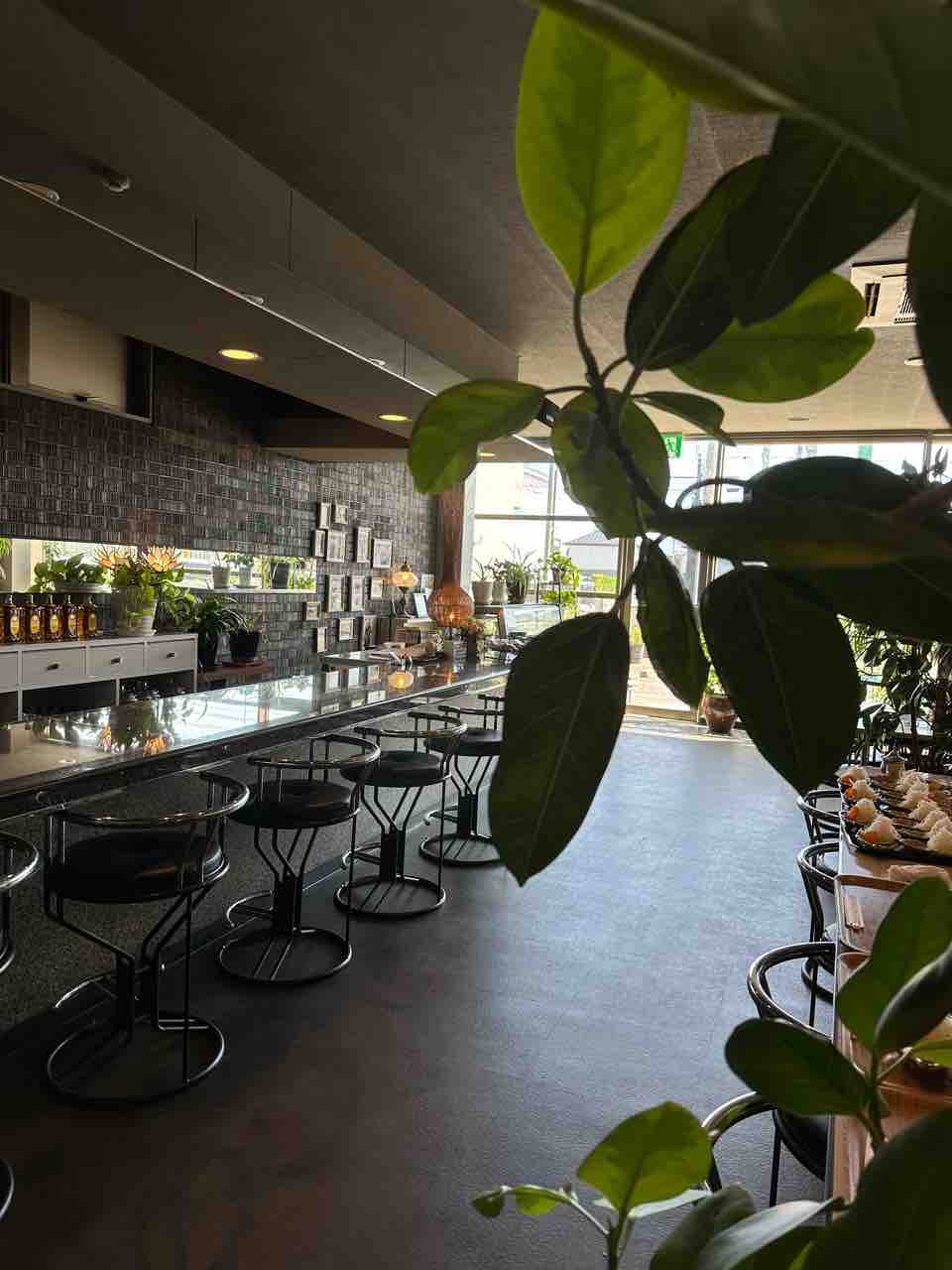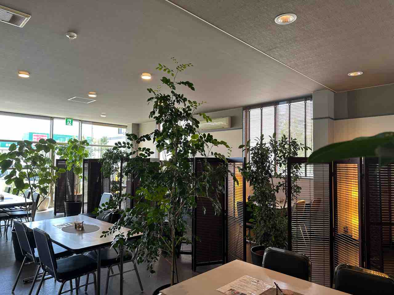 一方、建物正面から見て左手には、右手と同じくらいの広さの部屋が広がっています。仕切りのあるテーブル席が整然と配置され、より静かで落ち着いた雰囲気です。観葉植物が随所に置かれ、空間全体に自然の彩りを添えています。