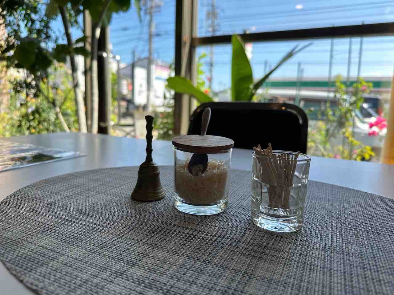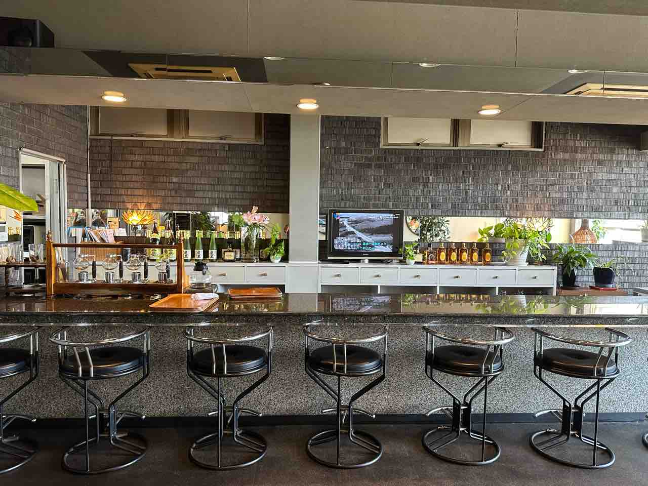 実際に着席したのはこの左手店内のテーブル席で、緑に囲まれた心地よい空間の中、ゆったりと食事を楽しむことができました。席は窓際で松前町の穏やかな景色が望め、リラックスした時間を過ごせます。