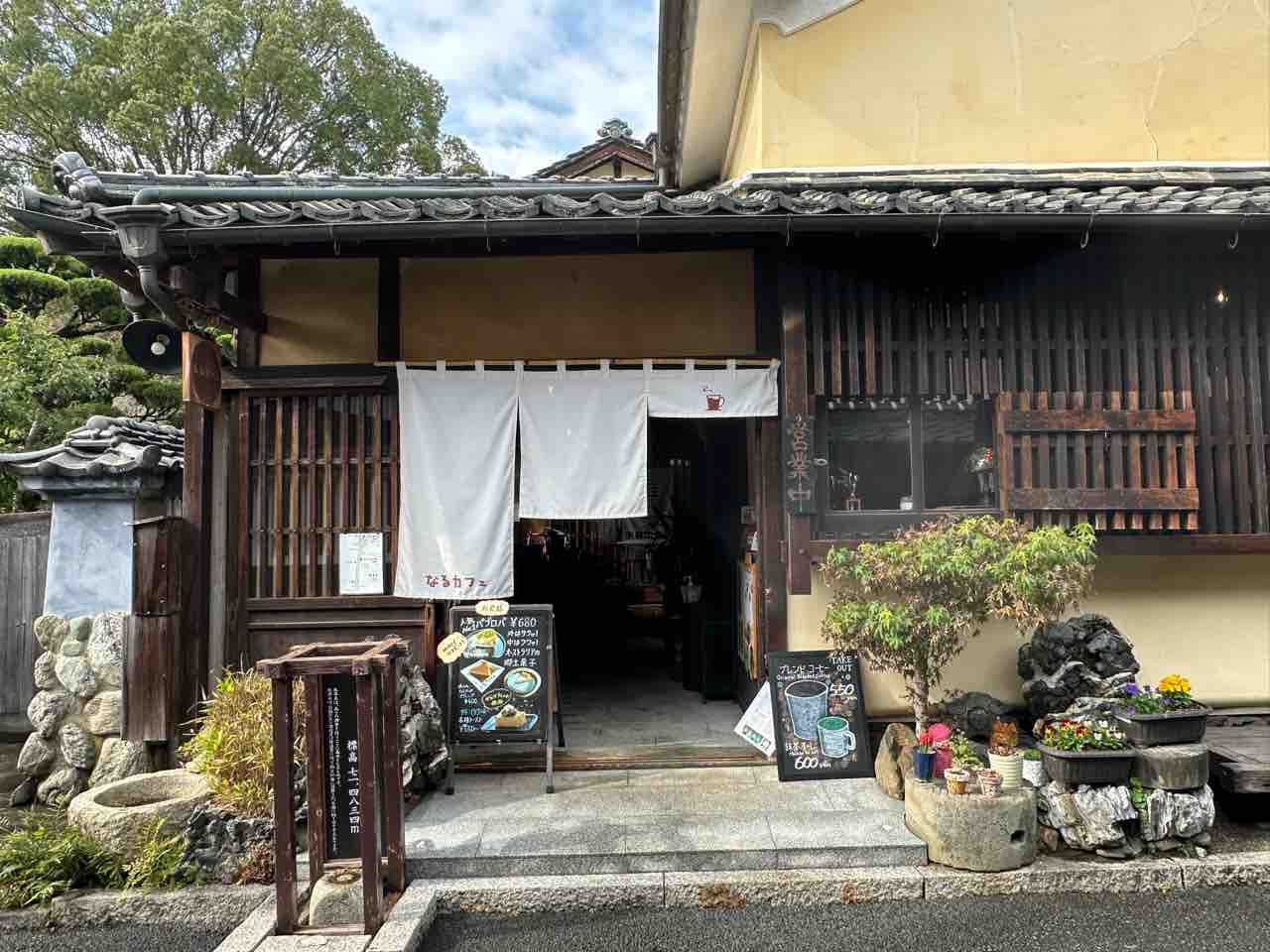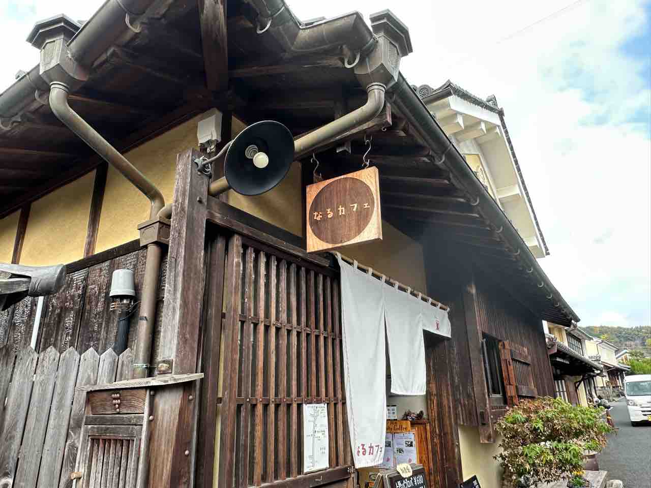 内子町の町家が並ぶ景色に寄り添うように建つ「なるカフェ」は、深い軒や木格子、やわらかな土壁が調和し、時間を重ねた古民家の温もりをそのまま残しています。入口にそっと掛かる白い暖簾は控えめながら welcoming な雰囲気を放ち、「ここでひと休みしませんか」と語りかけているようです。