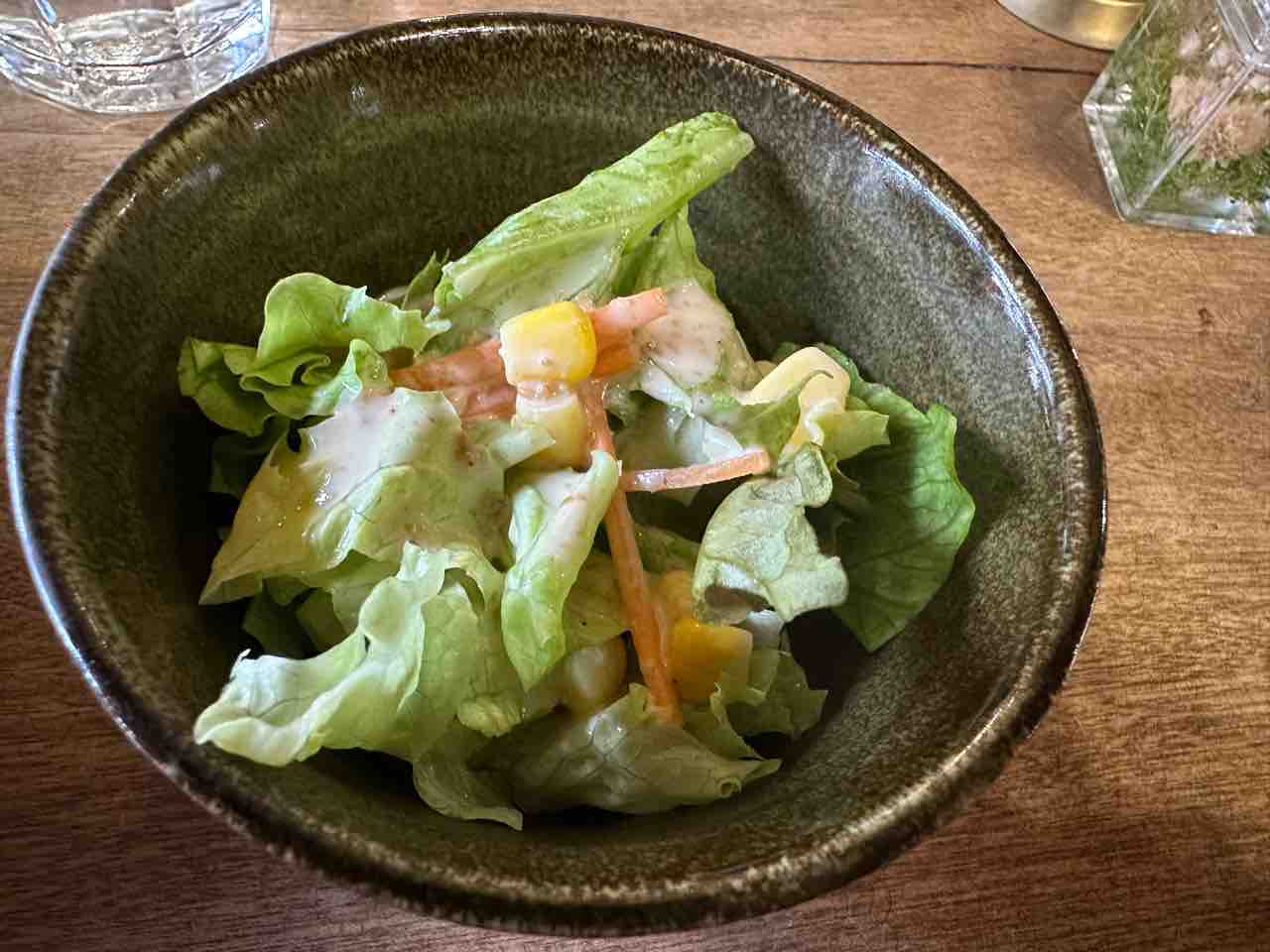 途中でレモンを絞ると爽やかに味変でき、最後まで飽きずに楽しめるのも魅力。付け合わせのサラダは彩りよく、クリーミーなドレッシングが口の中を整えてくれます。