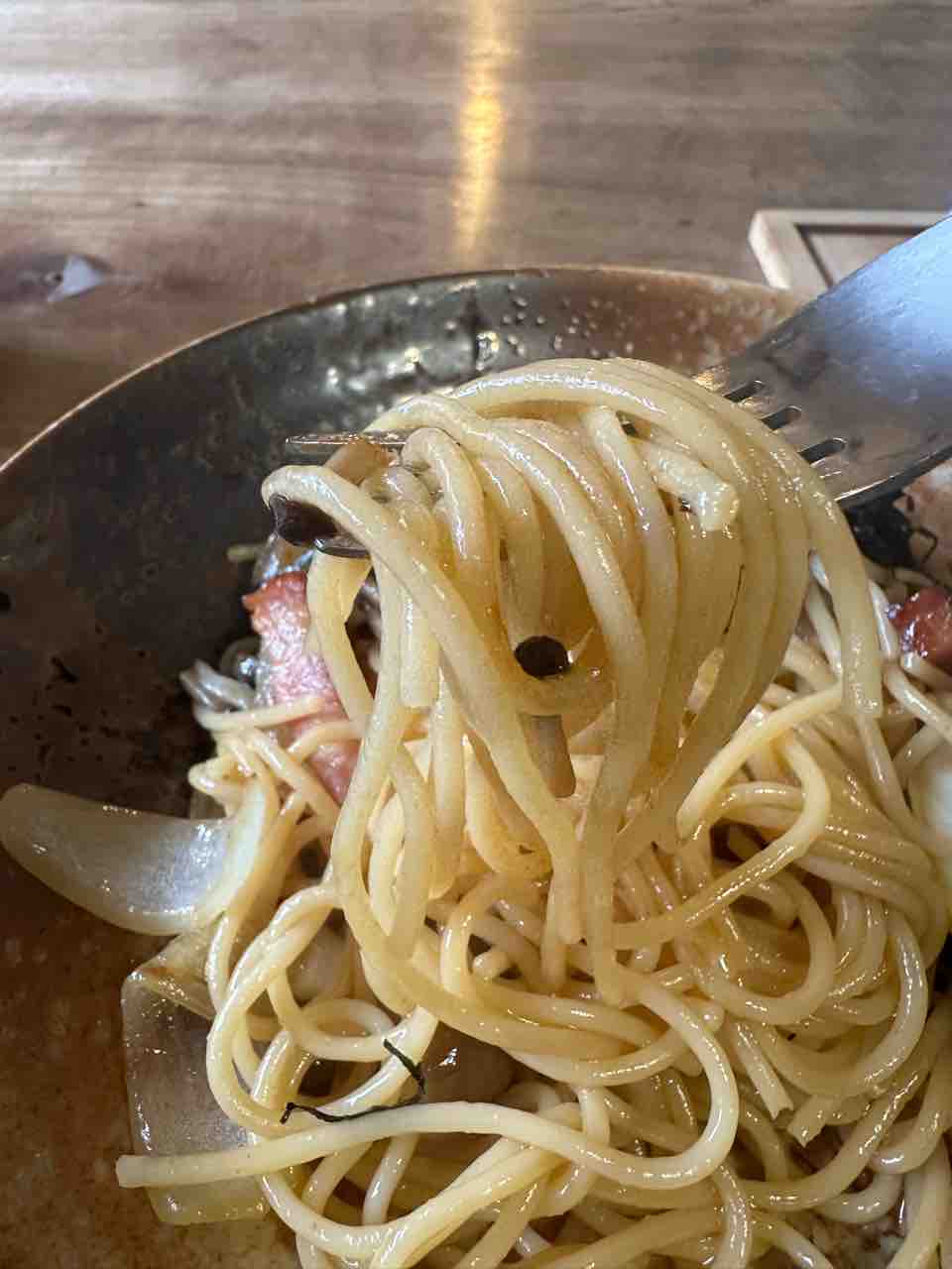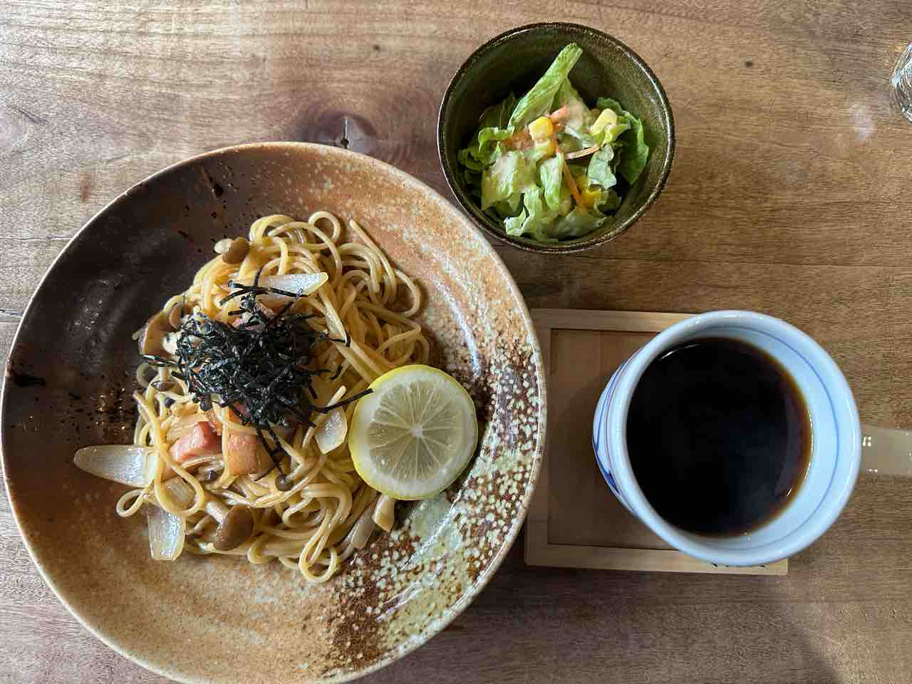 陶器の器に盛られたスパゲティは、だし醤油とバターの香りがふわりと広がり、厚切りベーコンやしめじの旨みがしっかり絡む一皿。まずはそのまま味わうと、素材の良さが生きたやさしい和風の旨みが口いっぱいに広がります。