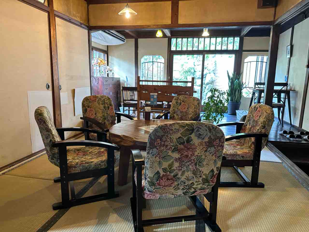 客室は、古民家の空気をそのまま残しつつ、座り心地の良さや動線の確保など細やかな工夫が凝らされた空間です。土壁と梁の存在感はそのままに、照明が優しい陰影を描き、落ち着いた雰囲気をつくっています。奥の座敷スペースは花柄の布張りが施されたアンティーク調の座椅子が並び、どこか懐かしい“和レトロ”の世界が広がります。