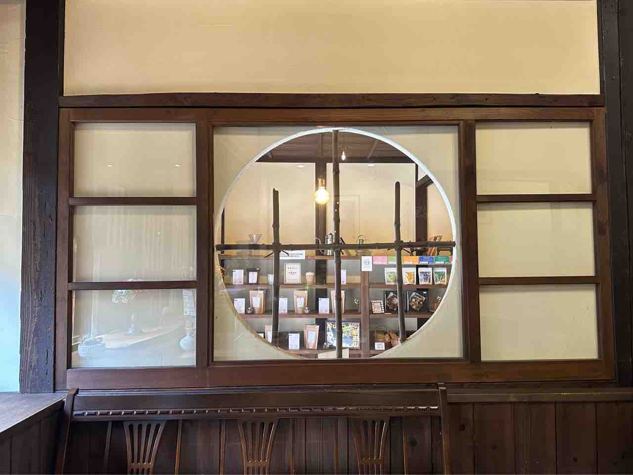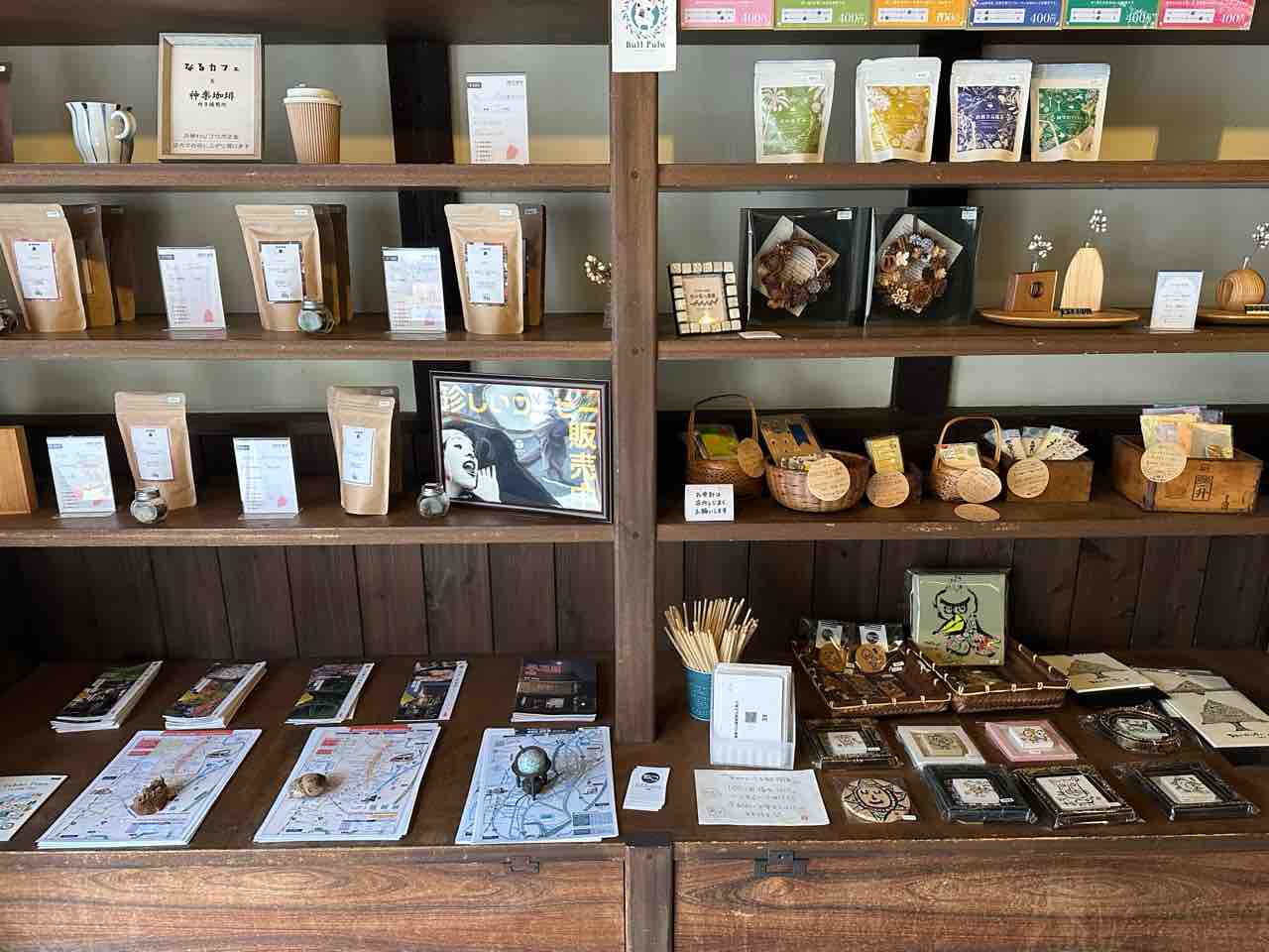 左手には木の質感を生かした明るいスペースがあり、自然光が差し込む窓辺ではふっと肩の力が抜けるような心地よさを感じます。入口付近には地元の特産品や雑貨が並ぶ棚があり、内子町らしい空気がぎゅっと凝縮された小さなギャラリーのよう。コーヒー豆、地域の工芸品、観光パンフレットなどが並び、ここだけで“町の息遣い”に触れられるのが魅力です。