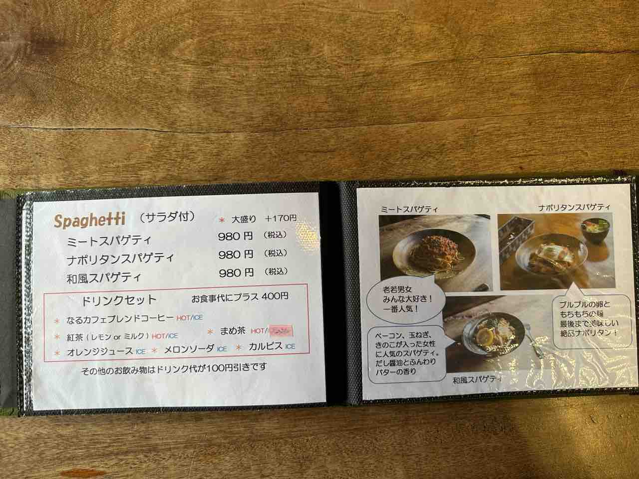 喫茶店らしい定番の食事メニューが揃う「なるカフェ」では、特にスパゲティ3種が人気。ナポリタンのぷるぷるとした麺や、豚肉の存在感ある食感は“懐かしさと満足感”を同時に味わえる仕上がりで、年代問わず愛されています。ミートソースや和風も丁寧に作られており、観光の合間にしっかり食べたい時にぴったりです。
