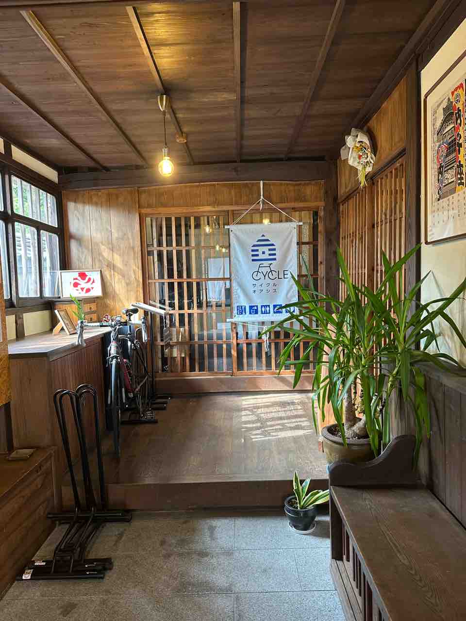 入口に足を踏み入れると、まず目を引くのが“サイクルオアシス”のサインと自転車ラック。ツーリングで訪れる人にとって安心できる設備が整い、旅人を歓迎する姿勢が伝わってきます。