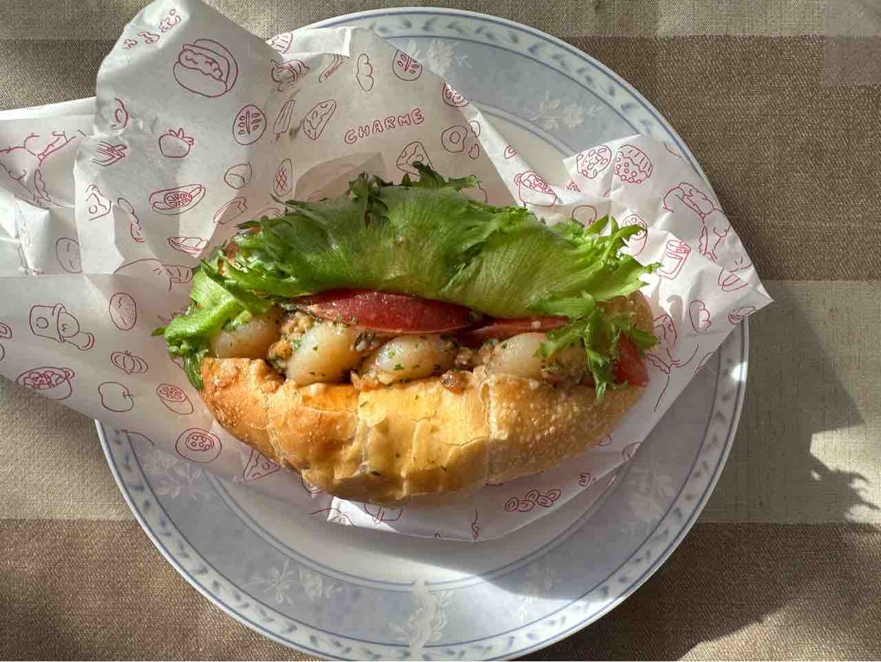 香ばしい塩パンに、ぷりぷりのガーリックシュリンプとまろやかなクリームチーズを合わせた贅沢な一品。ガーリックの香りとパンの塩気が絶妙で、温めるとチーズがとろけてさらに美味しさが増します。