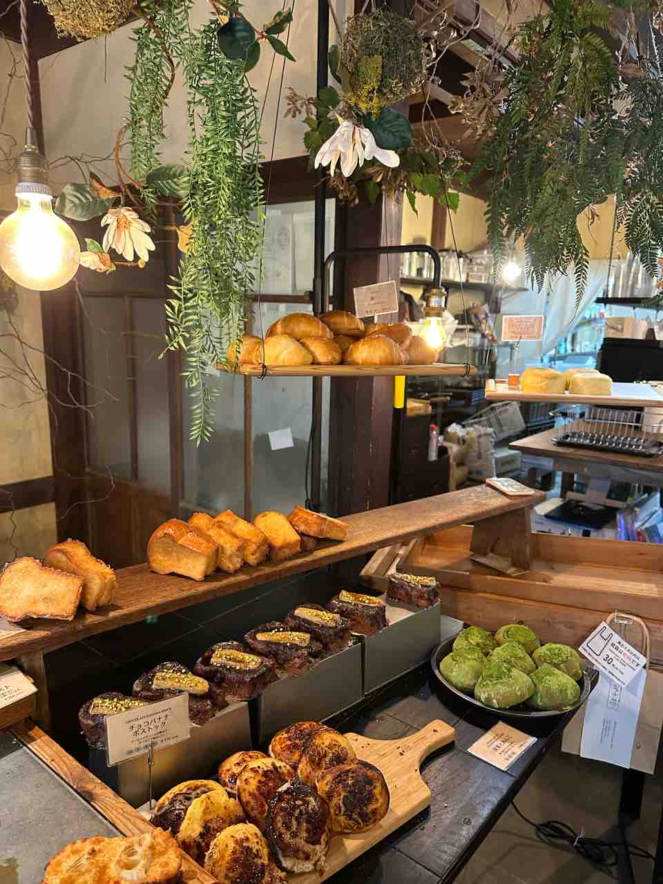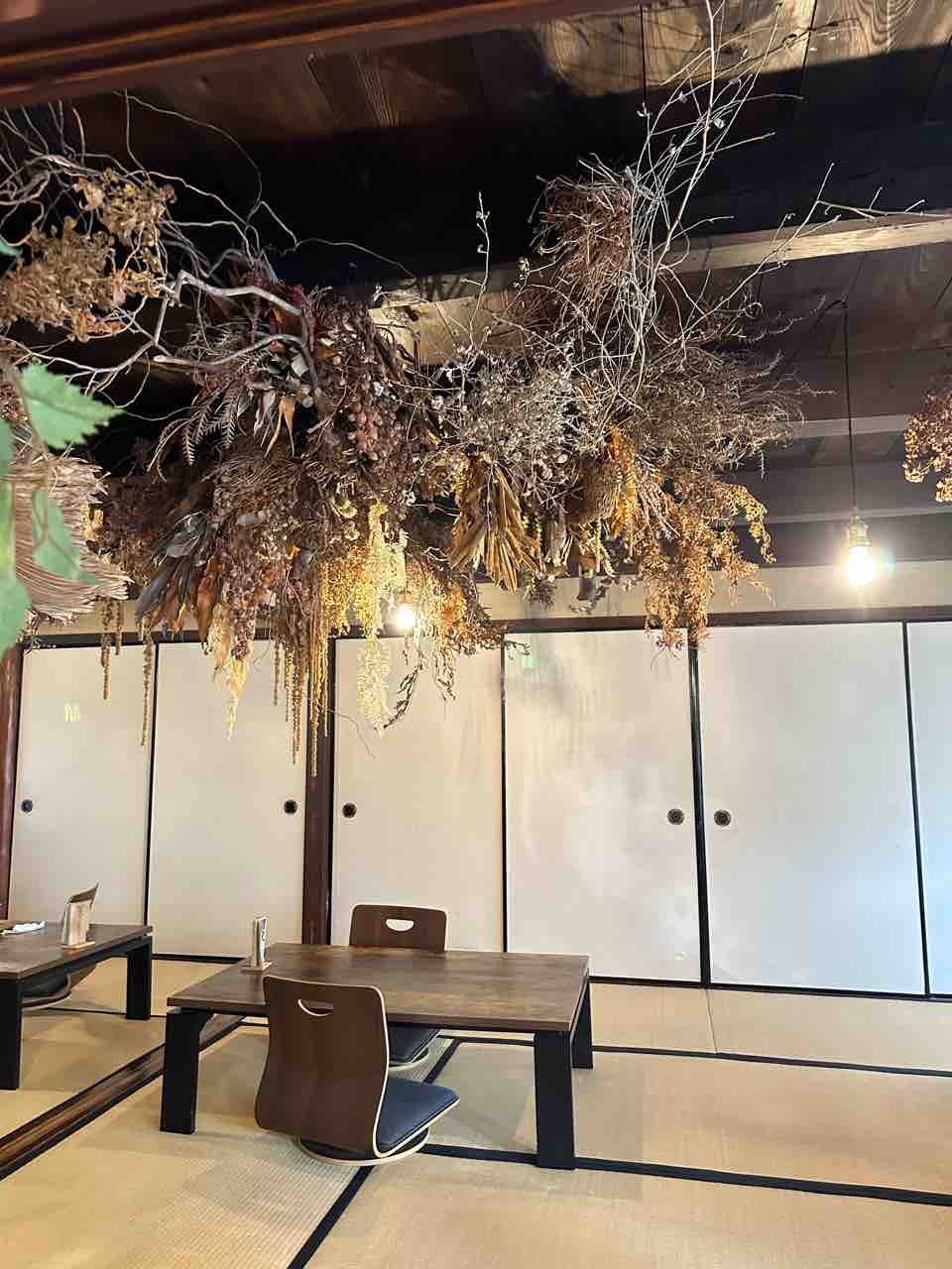 さらに横には畳敷きのイートインスペースがあり、古民家ならではの落ち着きが魅力。天井にはドライフラワーや枝を組み合わせた装飾が連なり、自然とアートが調和した特別な空間に。