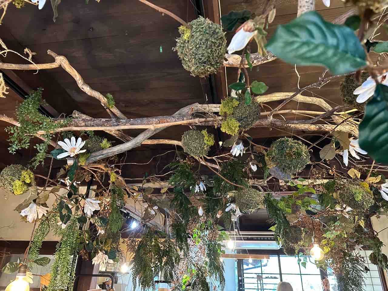 扉を開くと広がるのは、まるで小さな森に迷い込んだような幻想的な空間。天井には枝やツル、苔を使ったアートが広がり、ジブリ映画を思わせる非日常感が漂います。
