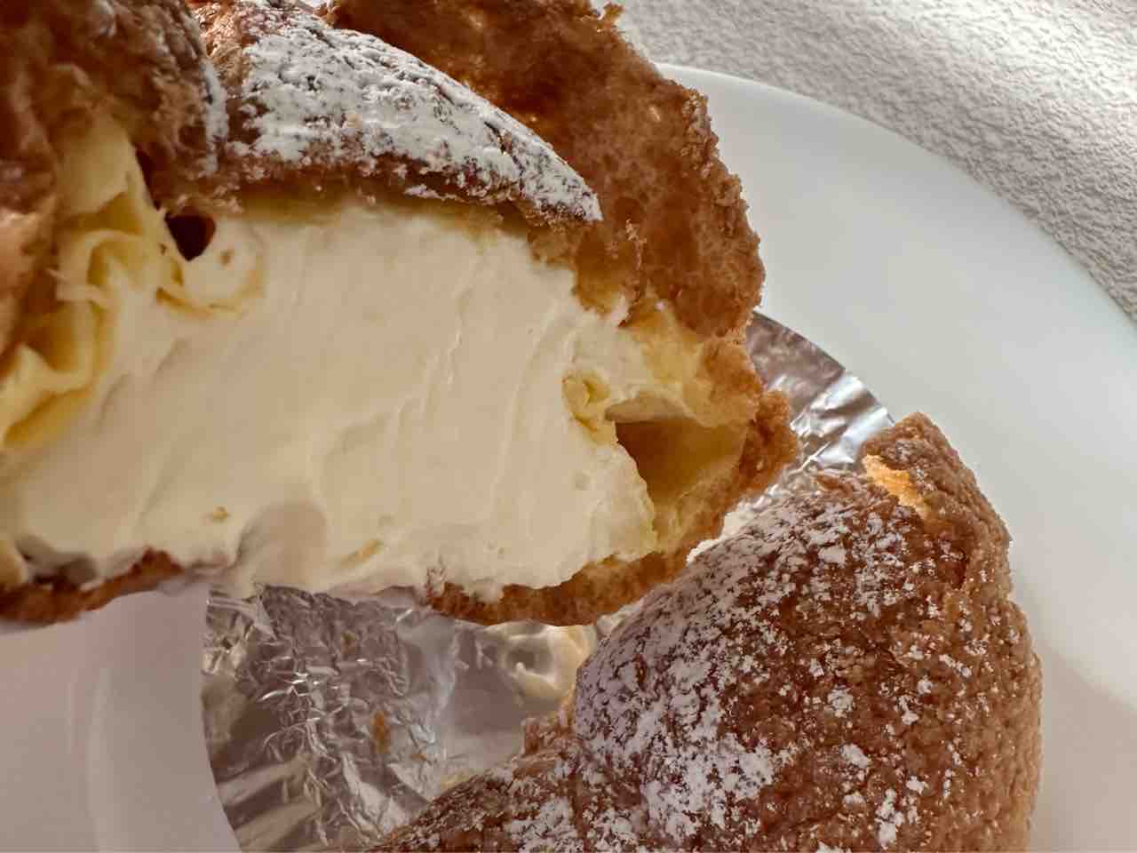 中には生クリームとカスタードを合わせた特製クリームがたっぷり詰まり、卵の優しい甘さと軽い口溶けが絶妙なバランス。粉糖がかかり、見た目にも華やかで満足度の高い一品です。